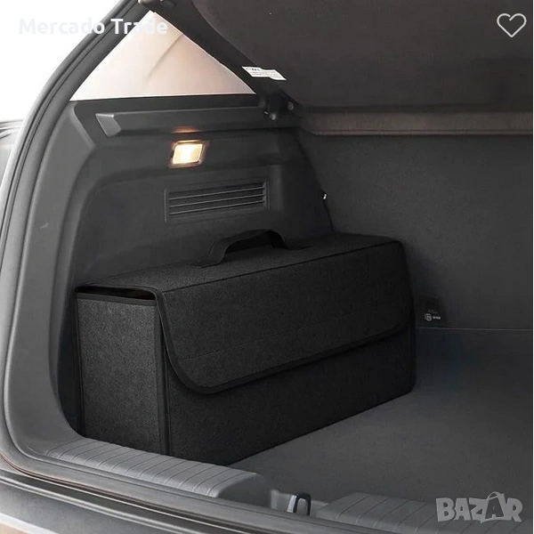 Сгъваема органайзер чанта за багажника на автомобила в черен цвят с капак, изработена от устойчив филц с здрави шевове. Закрепва се лесно и бързо към мокета на багажното пространство с велкро ленти. Лека е и подходяща за организиране както на дребни, така и на по-големи предмети, които искате да транспортирате или да държите постоянно в автомобила. Предотвратява разместването на вещите и така се избягват повреди. Когато не се използва, се сгъва и не заема място. Капакът също се затваря с велкро, а удобната дръжка улеснява отварянето.