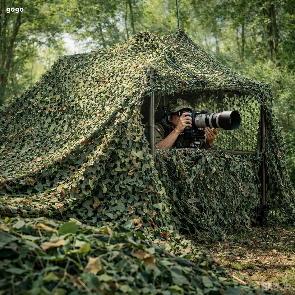 Военна камуфлажна мрежа 2x3 м, Oxford плат, за градина, лов и декорация, зелен камуфлаж Цена: 15 евро Размер: 2 м x 3 м (възможни вариации ±20 см поради еластичността на материала). Материал: Оксфордски полиестер – лек, здрав и устойчив на атмосферни влияния. Цвят: Зелен камуфлаж – многостепенен десен за естествено сливане. Устойчивост: Водоотблъскваща повърхност и устойчивост на UV лъчи за по-дълъг живот при употреба на открито. Монтаж: Лесно се закрепва с канапи, въжета, куки или скоби; може да се реже и коригира при необходимост (съвет: подгъване на ръбовете за предотвратяване на разнищване). Приложение: Маскиране на оборудване и превозни средства, слънцезащита на градински пространства, лов и наблюдение, декоративни инсталации с военен стил.
