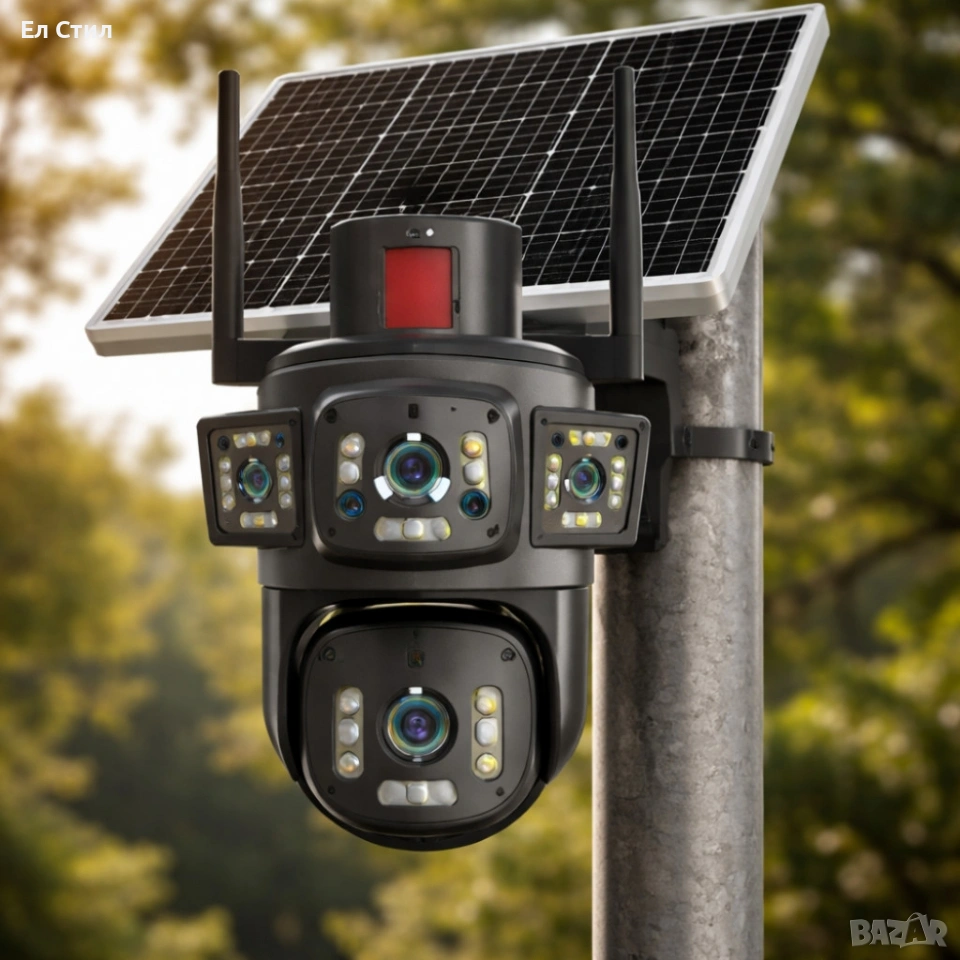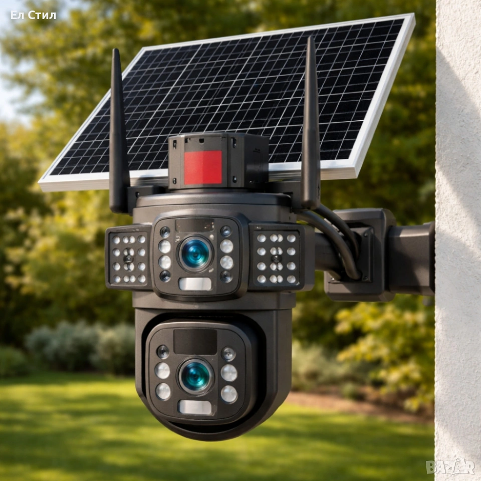 Соларна камера LYLU 4G със SIM карта - сигурност и спокойствие Кратък технически преглед за бърза ориентация: Тип продукт: Камера за външно наблюдение Технология: 4G PTZ (панорамно/накланяща се) Сензорна резолюция: 12 MP Видео резолюция: Full HD Размери на опаковката: 62 x 52 x 37.5 cm Интерфейс: 4G SIM карта, GSM модем Лещи: 4 лещи (четири изгледа) Нощно виждане: IR до 30 м, 41 LED диода Захранване: 18650 батерия + соларен панел Двупосочно аудио: Да (микрофон и високоговорител) Детекция на движение: Да, с аларма и известие на телефон Слот за карта памет: MicroSD до 128GB (карта не е включена) Управление: V380 Pro приложение (Android/iOS) Панорамиране/Накланяне: 355° панорамиране, 90° накланяне (6 мотора)