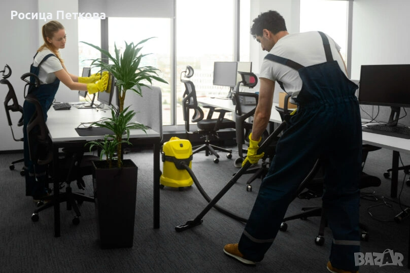 -Хигиенизация на работни зони: Детайлно почистване на офис обзавеждане, бюра и техника.
