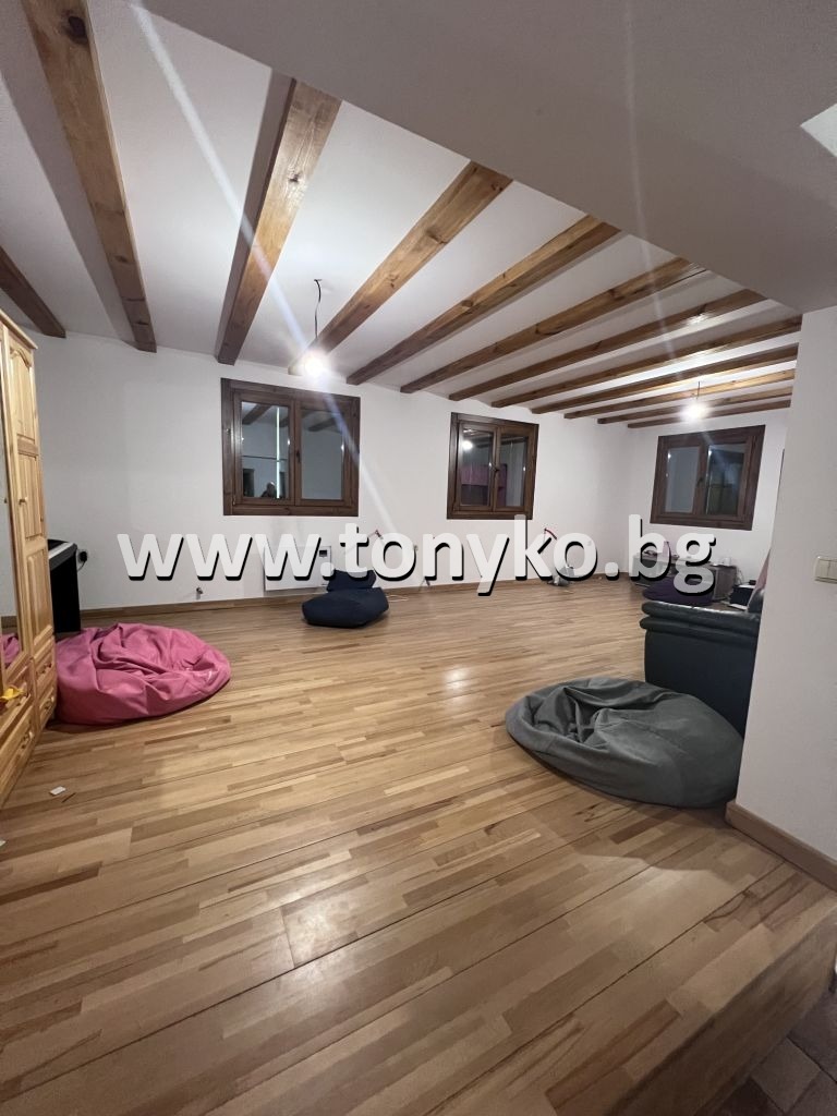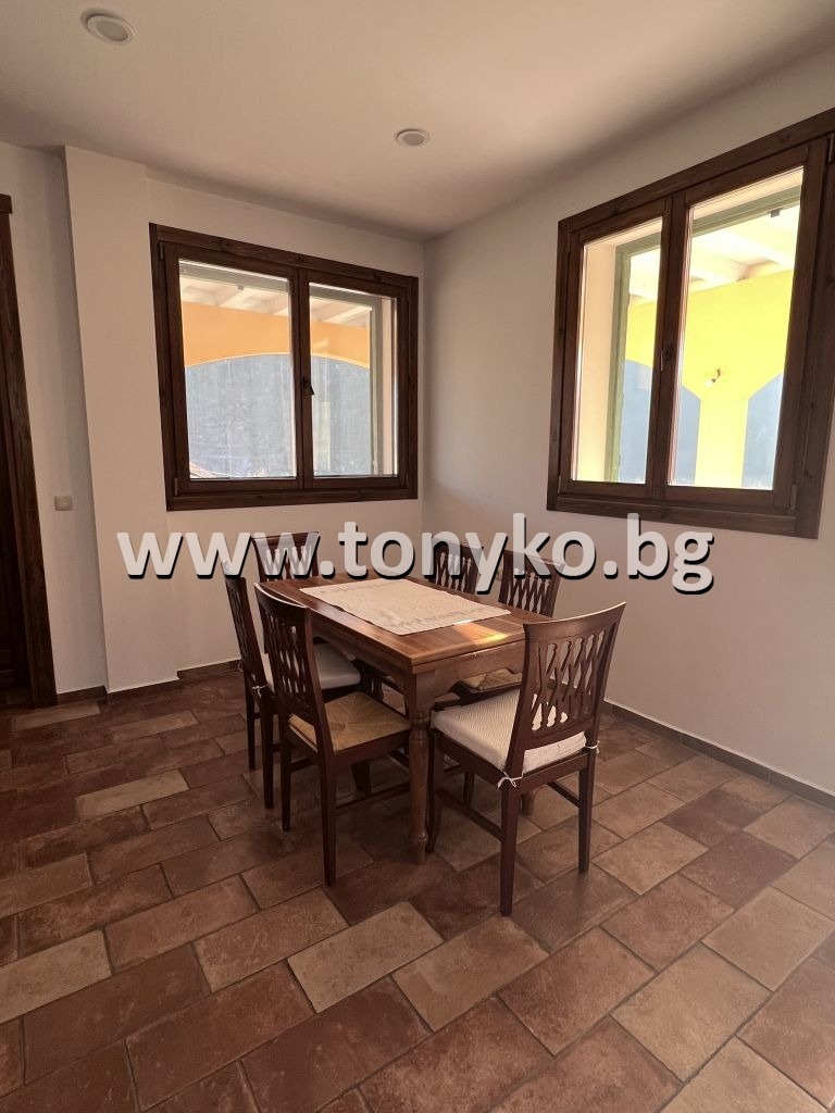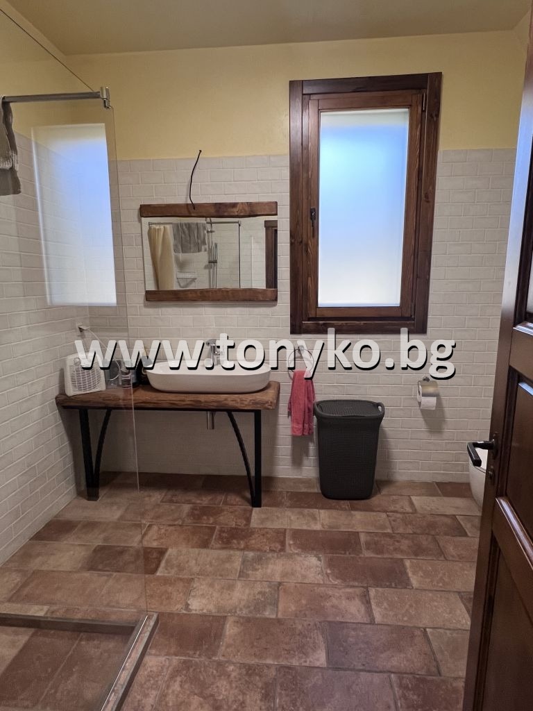 Реф. 310549; ТОНИКО имоти предлага за продажба нова къща (2022 г) с 1600 кв.м. двор в стил Тоскана . Намира се във Велинград. Захранена е с минерална вода за подово отопление и битови нужди. Сградата е на два етажа по 120 кв.м. всеки. Първият етаж е повдигнат на 45 - 60 см от терена и се състои от дневен тракт 50 кв.м., баня около 8 кв.м., отделна стая спалня, голямо помещение за пране и гладене с прозорец. От юг и от изток около къщата върви обиколна покрита галерия с ширина 3 метра, което е характерно за тосканската архитектура. От юг пред галерията е предвиден басейн. На 2-рия етаж са разположени 3 спални, голяма баня (около 8 кв.м.), зала 30 кв.м. за игри/деца и просторна панорамна тераса. Двата етажа са свързани с вътрешна стълба. Къщата е масивна с монолитна стоманобетонна конструкция върху фундаментна плоча. Стените са изпълнени от два пласта импрегнирани панели от масивно дърво с дебелина 2 х 8 см , допълнително топлоизолирани и от двете страни, облицовани отвътре с гипсокартон и измазани отвън с цветна минерална мазилка в тосканско жълто. Дебелината на външните стени е около 40 см. Дограмата е от масивно дърво и е обработена е с италиански импрегнати, с луксозен италиански обков. Прозорците са покрити с масивни дървени капаци в тоскански стил. Настилките са от луксозна италианска керамика, закупена в Италия. Къщата е напълно обзаведена, с подово отопление (с минерална вода) и камина в дневната. Италианска кухня с бар плот и окачен таван над плота. Вградено лед-осветление в таваните над дневното пространство. Подходяща е за живеене или къща за гости, от която би имало много добра доходност. За контакт: Антоанета Ненова 0898 613 555