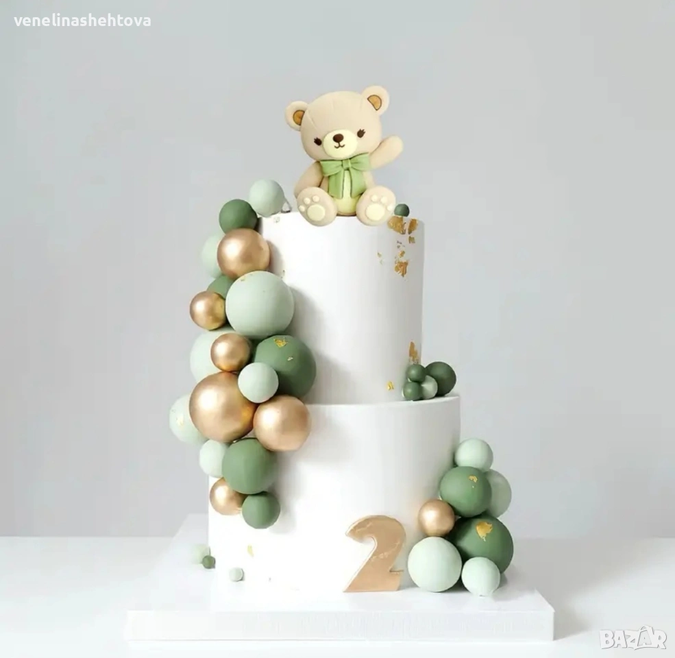 Комплект фигурка мече с топчета зелен бежав златист цвят декорация на торта → Обява 53806573