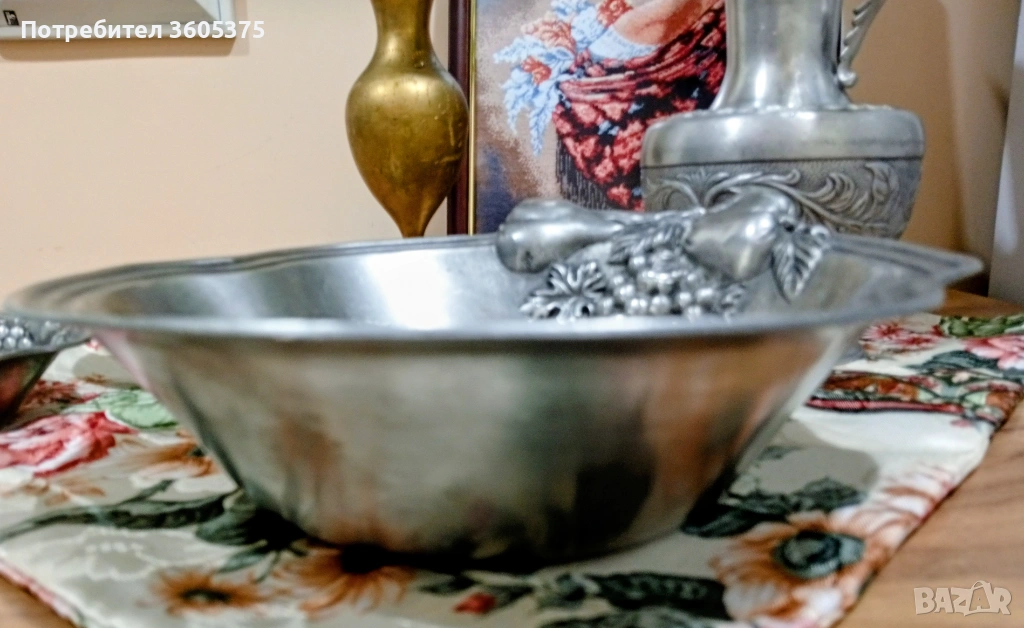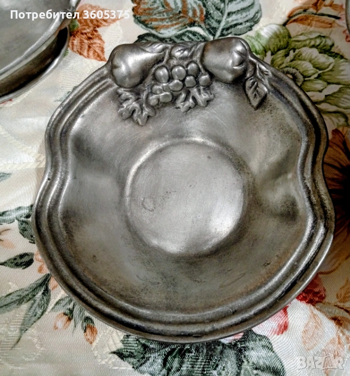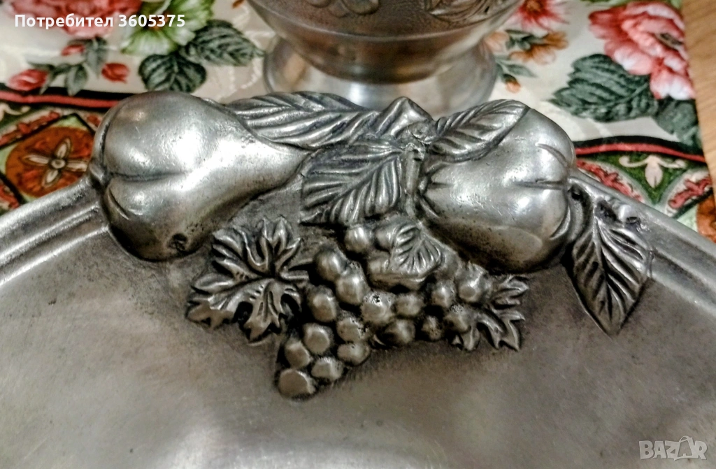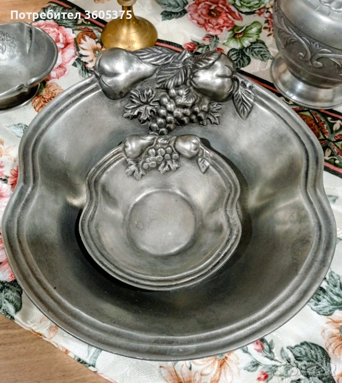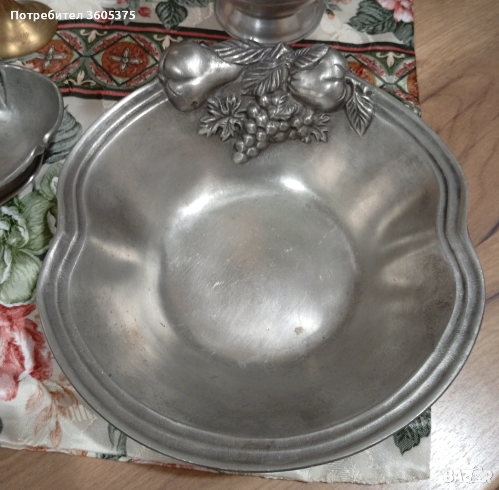 Два калаени съда с ковани ,релефни плодове.Голям с размери 22/23 и малък с размери11,5/12,5 .Маркирани за произход.Обща цена за двата 20 евро/39,12 лева.