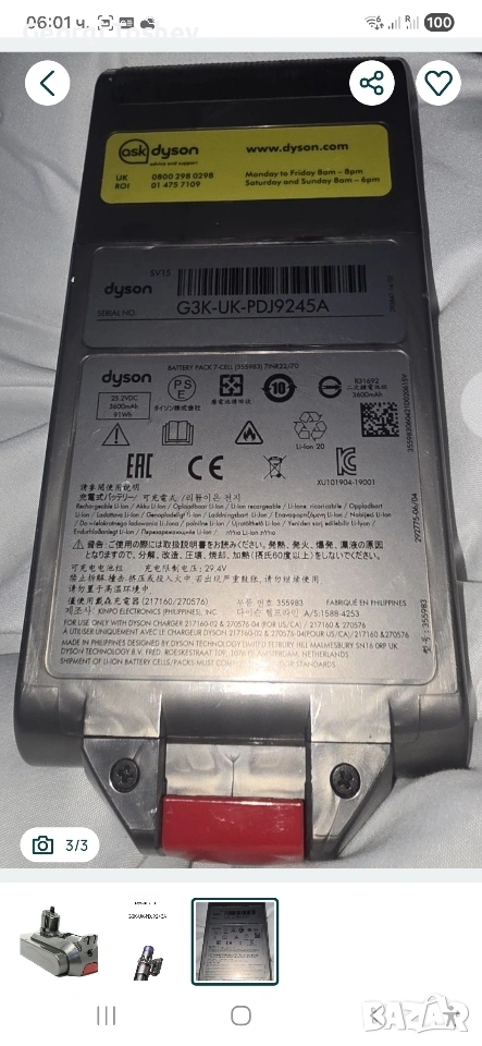 Оригинална Батерия за Dyson V11 ,3600 mah, 91 Wh, снимка 1 - Прахосмукачки - 53806948 Оригинална Батерия за Dyson V11 ,3600 mah, 91 Wh, снимка 2 - Прахосмукачки - 53806948 Оригинална Батерия за Dyson V11 ,3600 mah, 91 Wh, снимка 3 - Прахосмукачки - 53806948 1/3