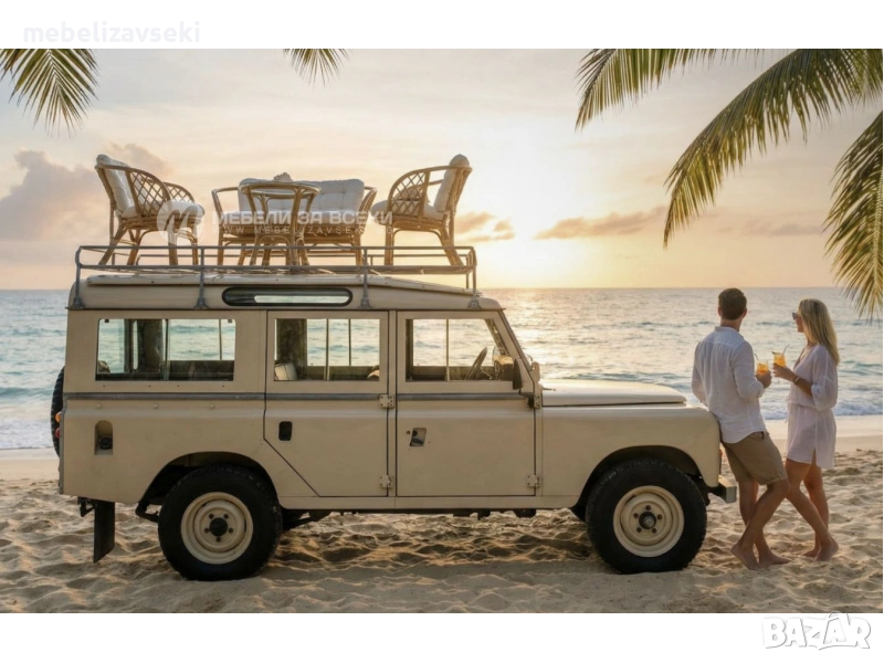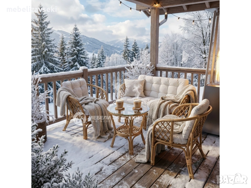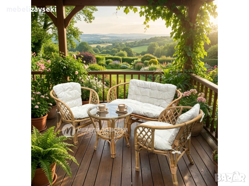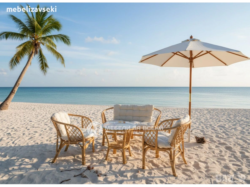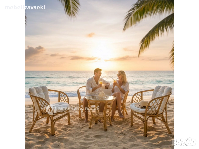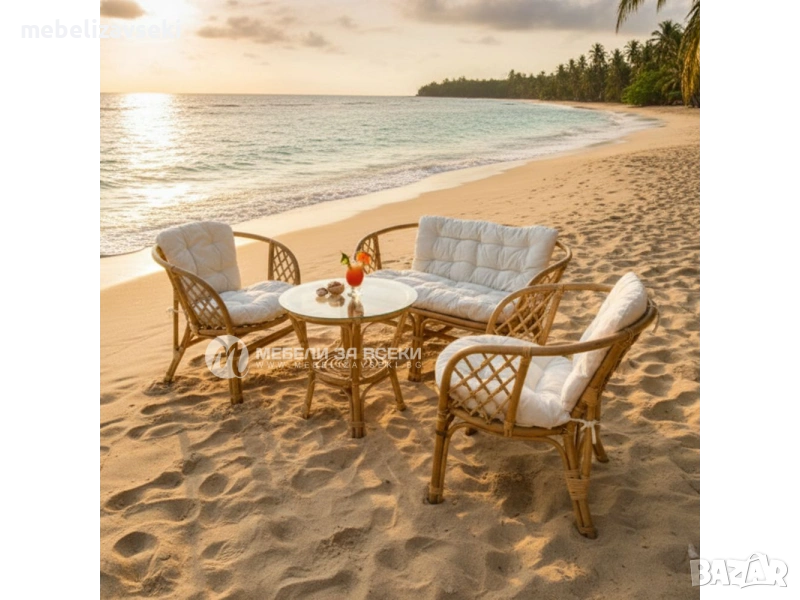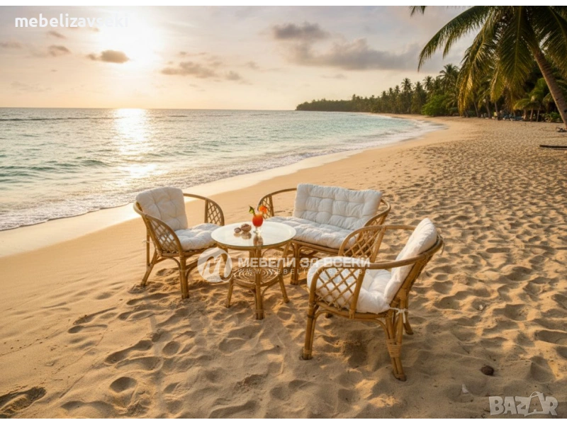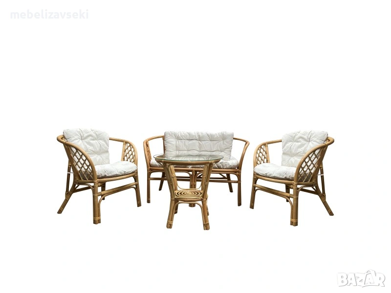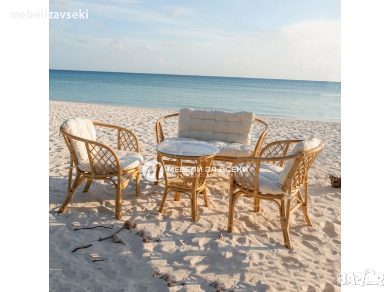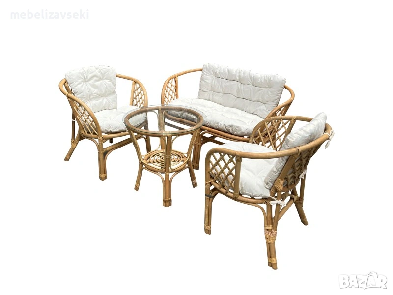 Материал: Естествен ратан/ Възглавници - полиестер/ Маса - ратан/стъкло.