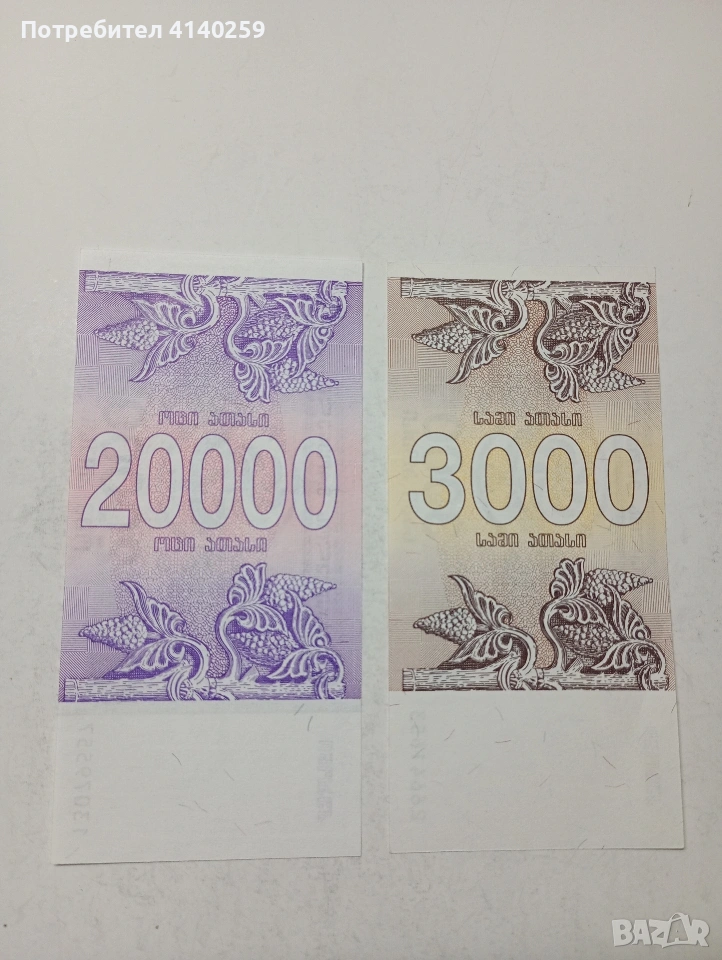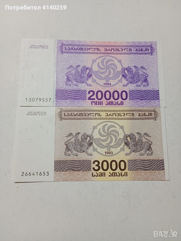 ГРУЗИЯ БАНКНОТИ 20,000 ЛАРИ 1994 Г 3,000 ЛАРИ 1993 Г СЪСТОЯНИЕ НОВО ЦЕНА ЗА 2 БРОЯ ПОЛУЧАВАТЕ СНИМАНИТЕ БАНКНОТИ РАЗГЛЕДАЙТЕ ДРУГИТЕ МИ ОБЯВИ ДА КОМБИНИРАТЕ ДОСТАВКА ЕКОНТ ЗА ВАРНА ЛИЧНО