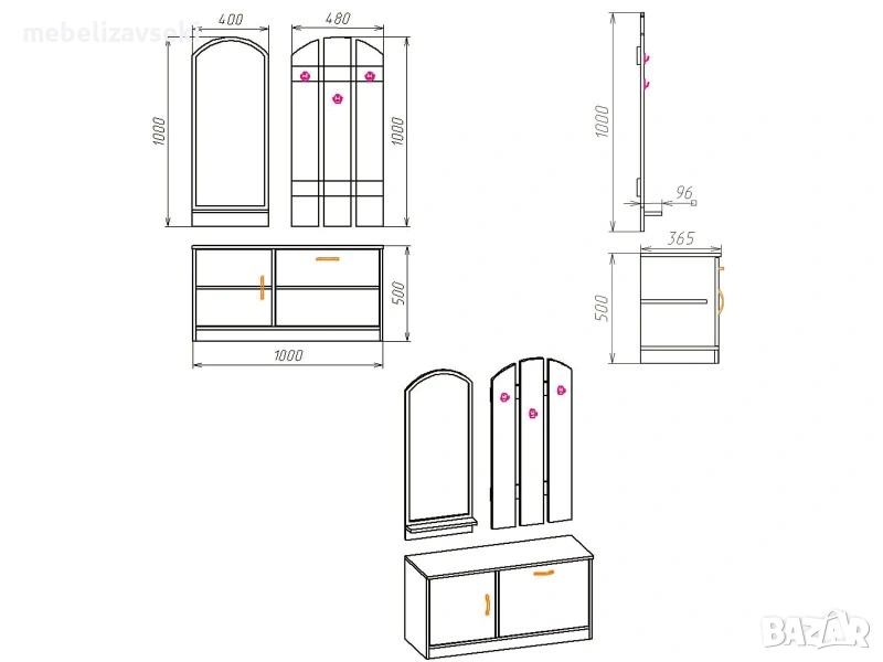 • 100/ 36,5/ 50 (шкаф) +100см (огледало).