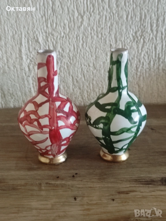 Вентидж малки вазички, апстрактно ръчно рисувани, отлични със златист кант на дъното, височина-10 см. Цена за двете- 6 евро.