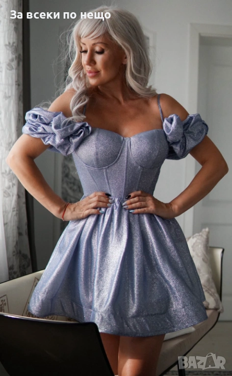 Дамска Синя Елегантна Официална Къса Рокля С Паднали Рамене За Специални Събития Код Roni14 → Обява 53807566