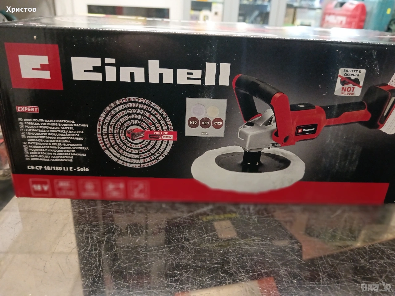 Ново с гаранция батерия и зарядно. Цена 150.00€ Акумулаторна полираща и шлифовъчна машина Einhell CE-CP 18/180 Li E-Solo. Тип машина: Безжична 2-в-1 машина за полиране и шлайфане от серията Power X-Change. Диаметър на диска: Голям шлифовъчен диск с диаметър 180 мм. Двигател: Оборудван с безчетков електродвигател за по-дълъг живот.