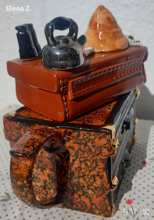 Сандъкът и куфарът са изработени и боядисани да наподобяват луксозни кожени такива с атрактивни златни закопчалки и панти.