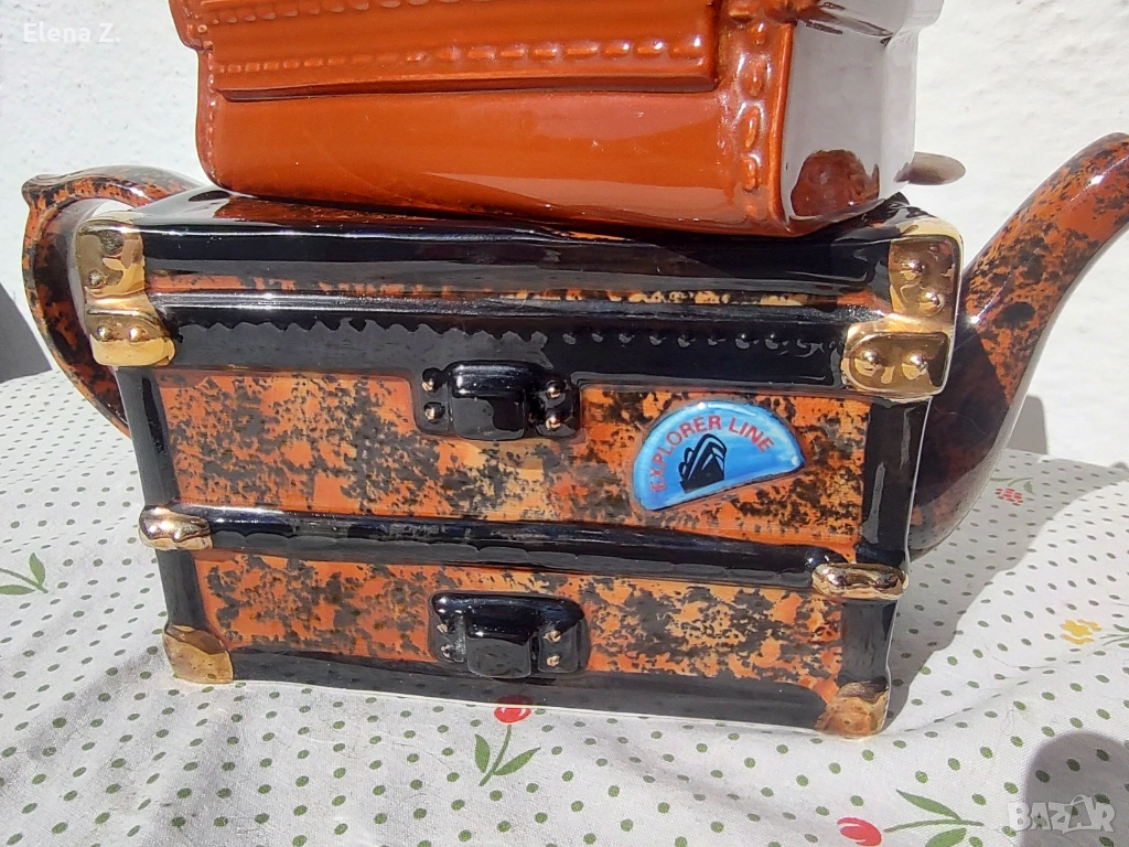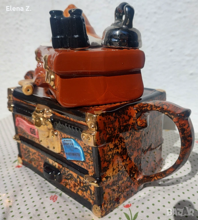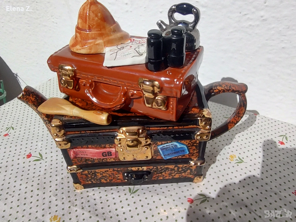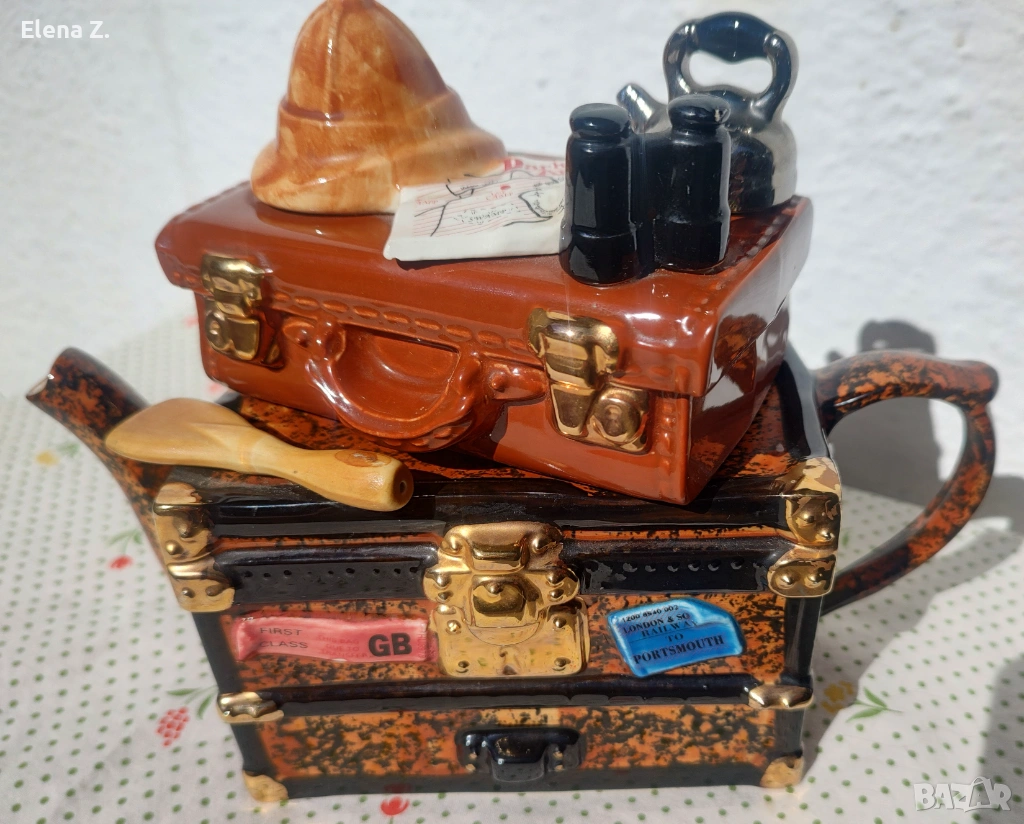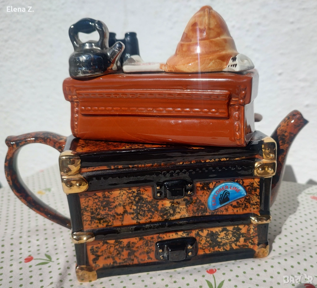 Чайникът е ръчно оформен като ретро сандък и куфар за пътешествия. Темата е пътуване за сафари в Африка. Капакът, който е кожен куфар върху който има сложена типична шапка за сафари, бинокъл, карта на “тъмна Африка” и разбира се чайник за пътника. На сандъка има гребло, както и етикети “първа класа”, пристанище Портсмут и име на корабната линия “Explorer.”