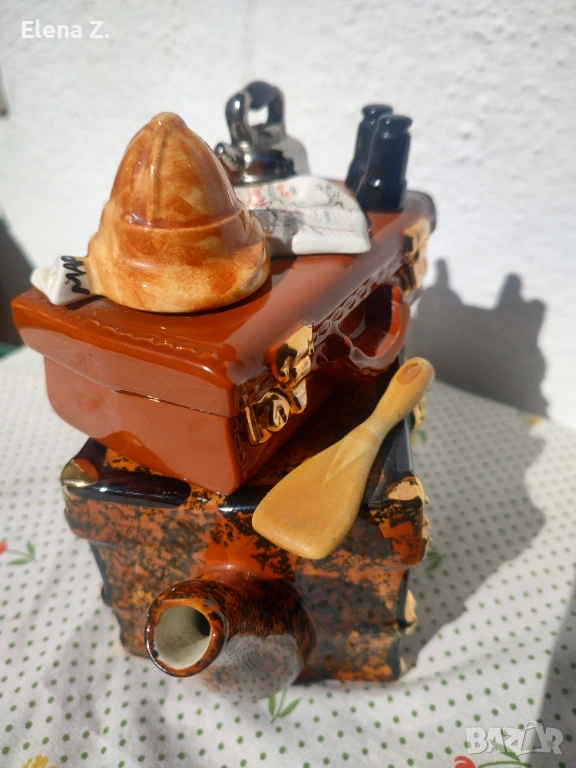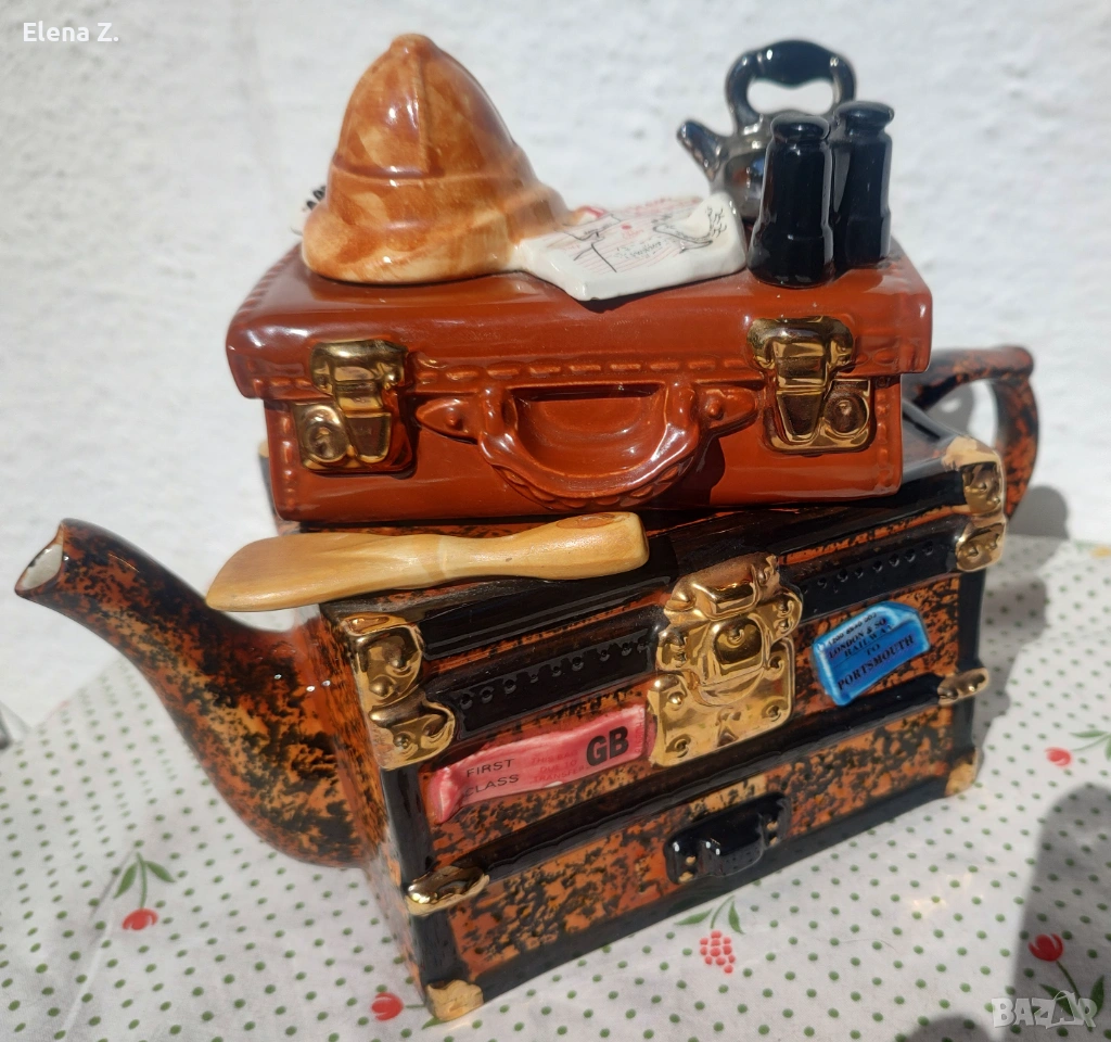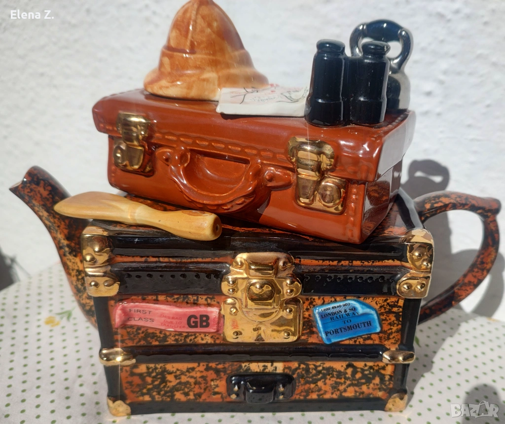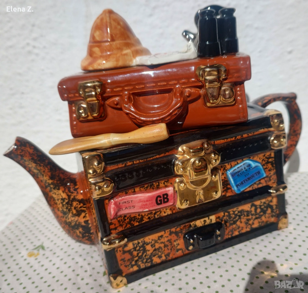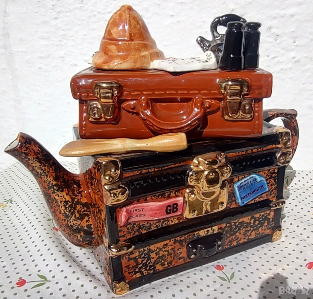 Чайникът е ръчно оформен като ретро сандък и куфар за пътешествия. Темата е пътуване за сафари в Африка. Капакът, който е кожен куфар върху който има сложена типична шапка за сафари, бинокъл, карта на “тъмна Африка” и разбира се чайник за пътника. На сандъка има гребло, както и етикети “първа класа”, пристанище Портсмут и име на корабната линия “Explorer.”
