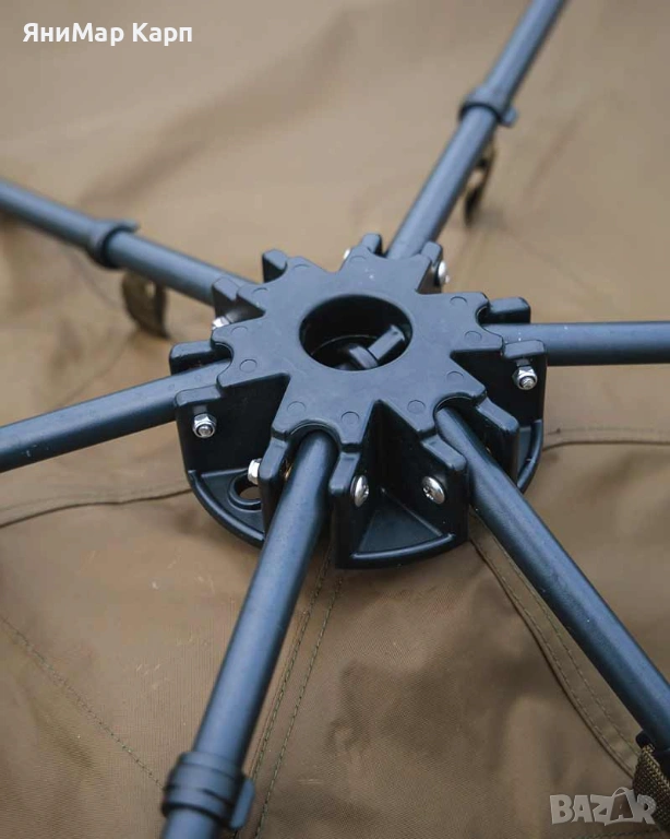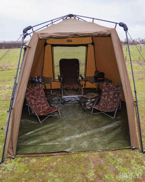 Бързо разпъващ се заслон с размер XL. Отличен за дълги риболовни сесии и събиране с приятели и семейство.
