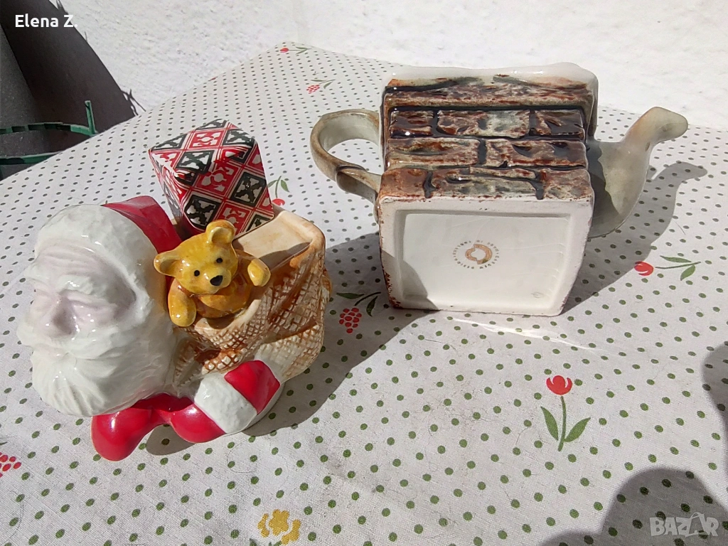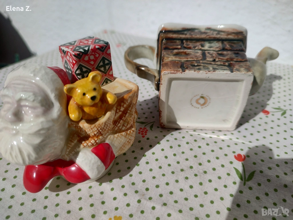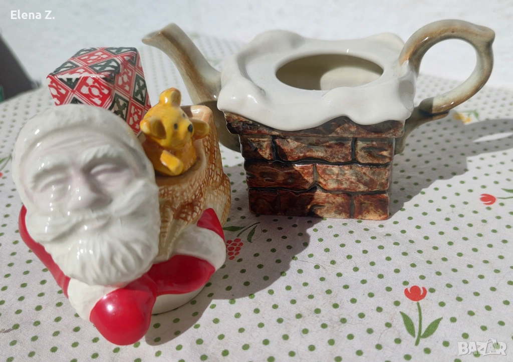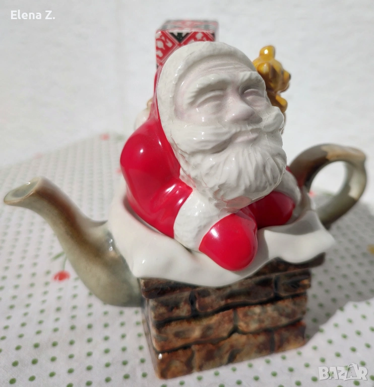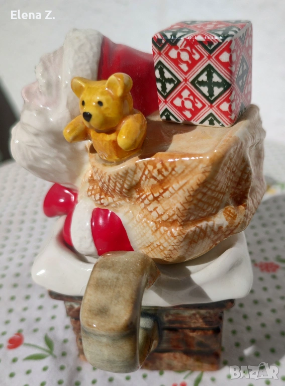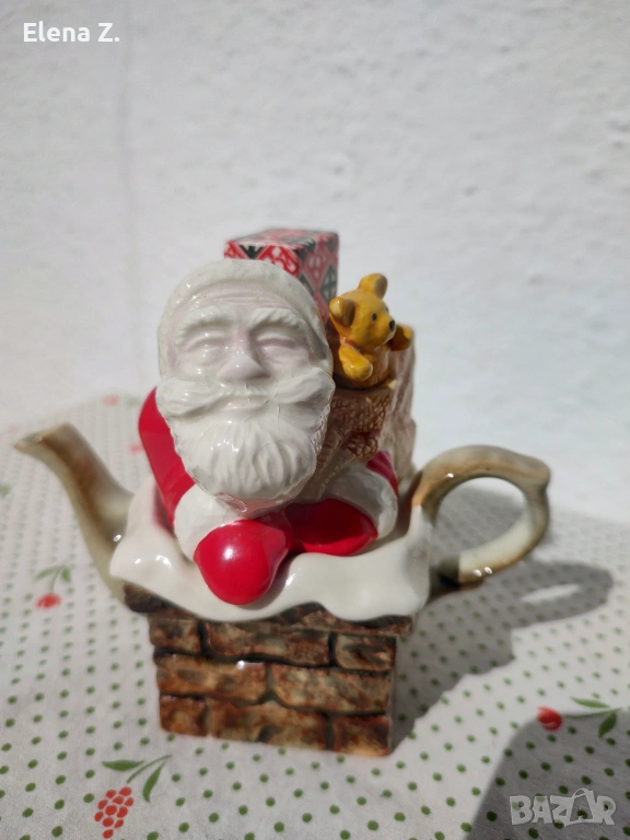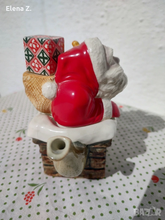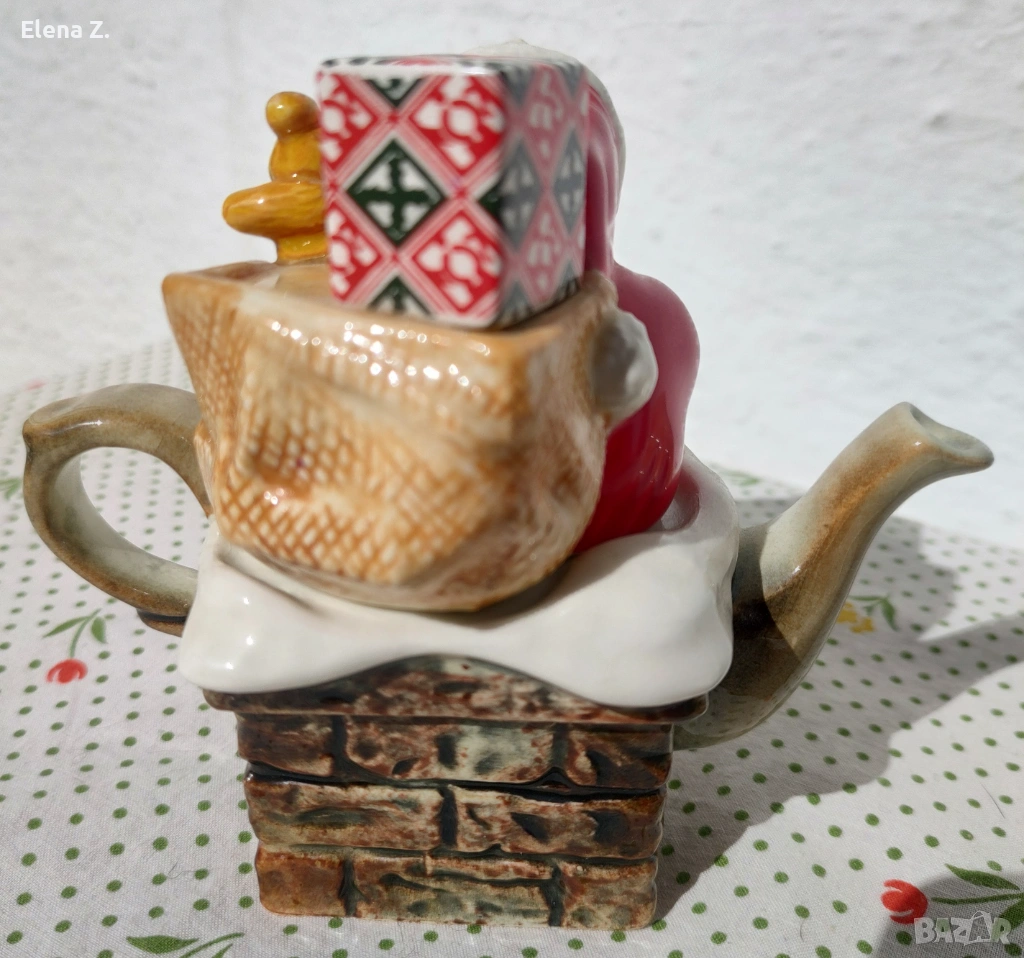 Самият чайник е оформен като тухлен комин, а капачето е с дядо Коледа с подарък и мече.