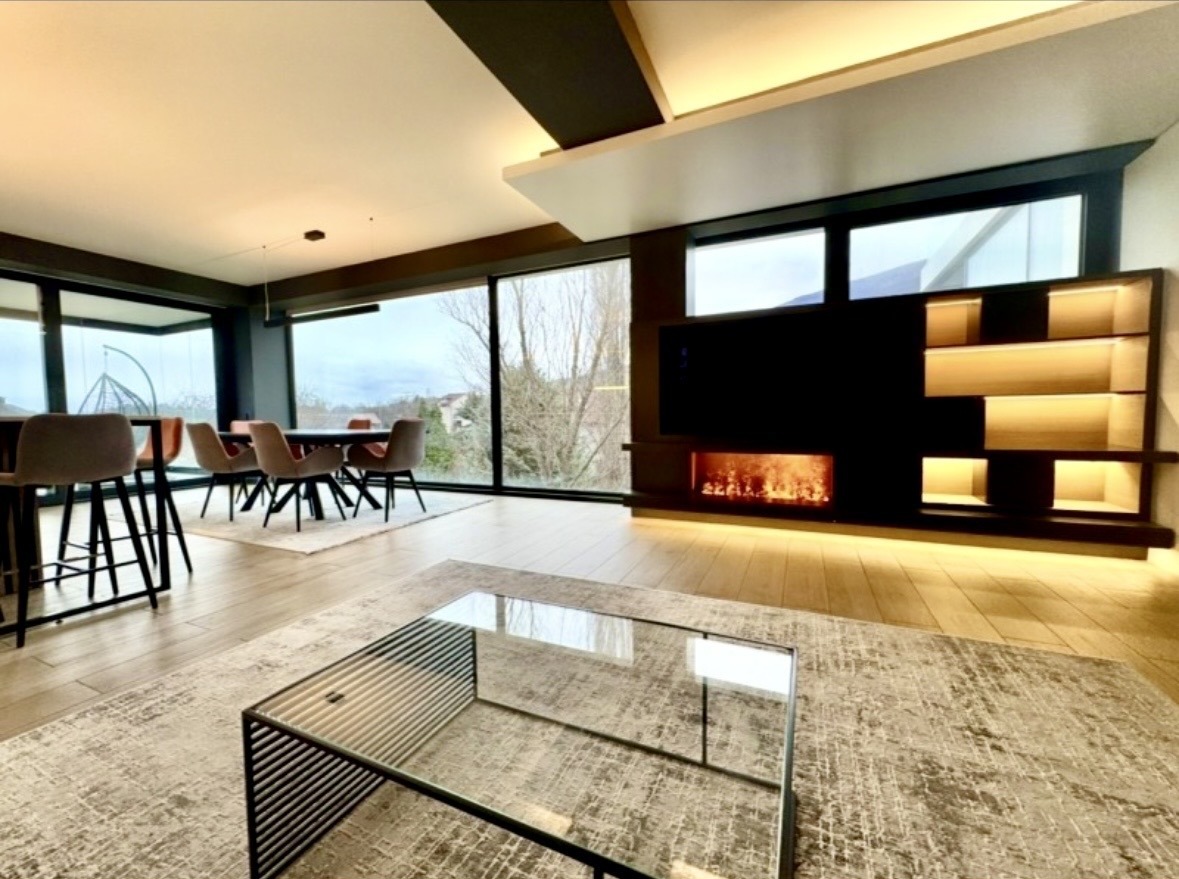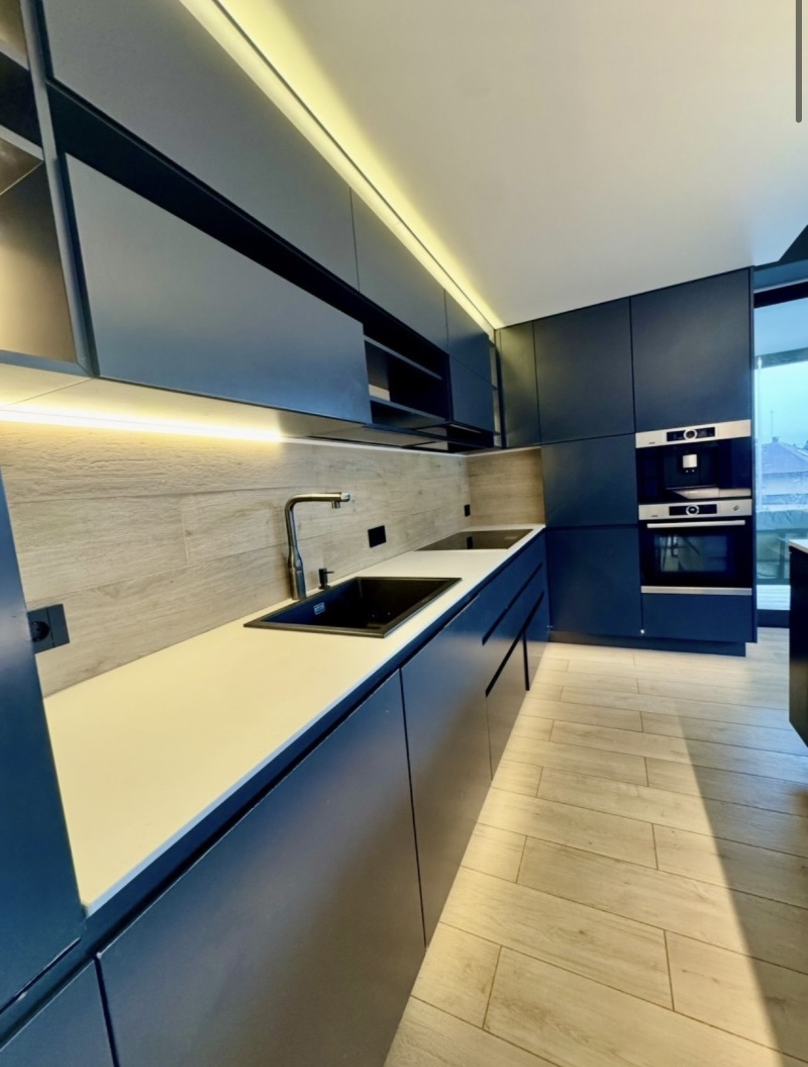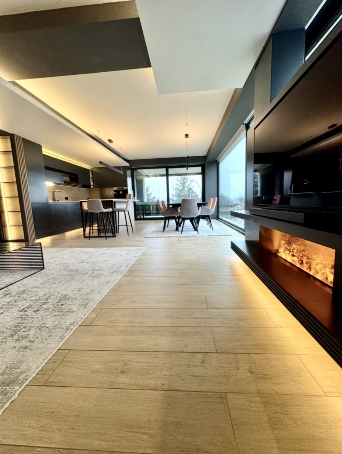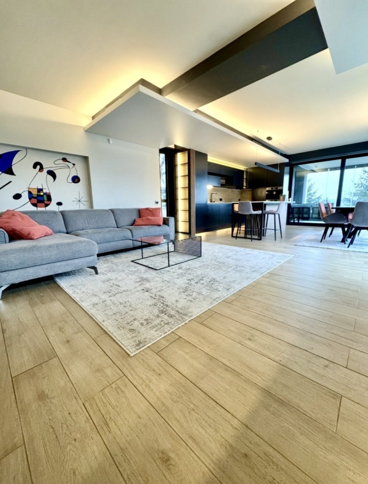 Впечатляваща просторна дневна с отлично организирана кухненска част, оборудвана с вградени електроуреди Bosch и Liebherr,