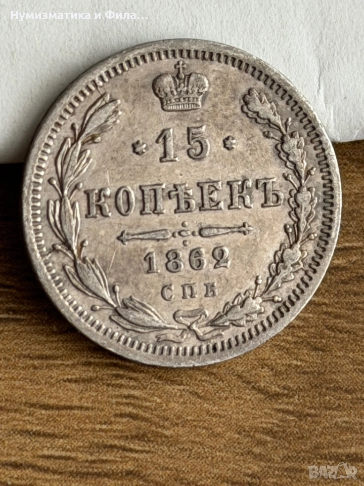 Предлагам сребърна монета 15 копейки от 1862 година – период на Руската империя.