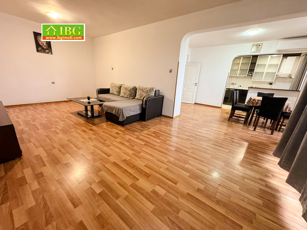 Имотът разполага с много голяма всекидневна с трапезария и кухня, създаващи комфортно и функционално жилищно пространство. Кухнята е напълно оборудвана с всички необходими уреди, чисто нови и готови за незабавно ползване.