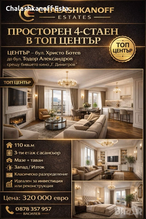 Chalashkanoff Estates продава 4-стаен (3 стаи + преходен хол + кухня + остъклена тераса + баня + wc + мазе + таванско) 110 кв.м. на бул. Христо Ботев (срещу бившето кино "Г. Димитров, между хотел "Central" и бул. "Тодор Александров". Трети надпартерен етаж, асансьор, с изглед към бул. "Христо Ботев" на запад, Арменския културен дом и Музикалното училище на изток.