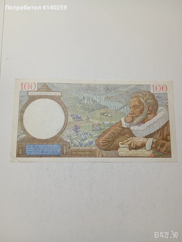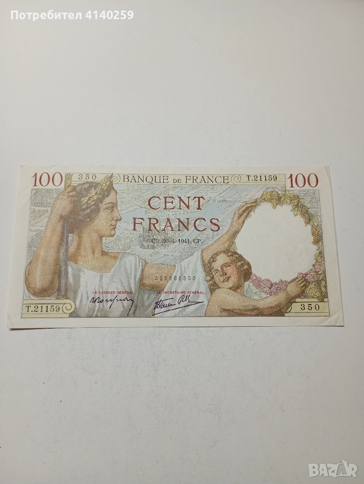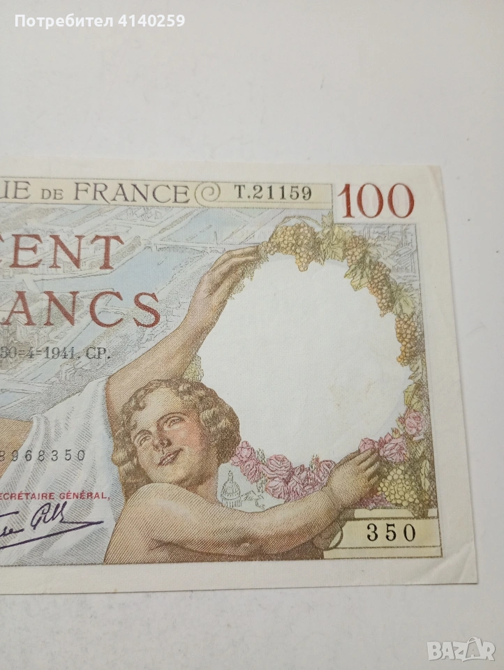 ФРАНЦИЯ БАНКНОТА 100 ФРАНКА 1941 Г СЪСТОЯНИЕ ОТЛИЧНО ВИДИМО ПОЛУЧАВАТЕ СНИМАНАТА БАНКНОТА РАЗГЛЕДАЙТЕ ДРУГИТЕ МИ ОБЯВИ ДА КОМБИНИРАТЕ ДОСТАВКА ЕКОНТ ЗА ВАРНА ЛИЧНО