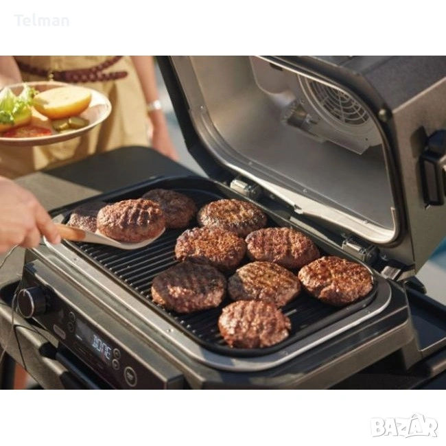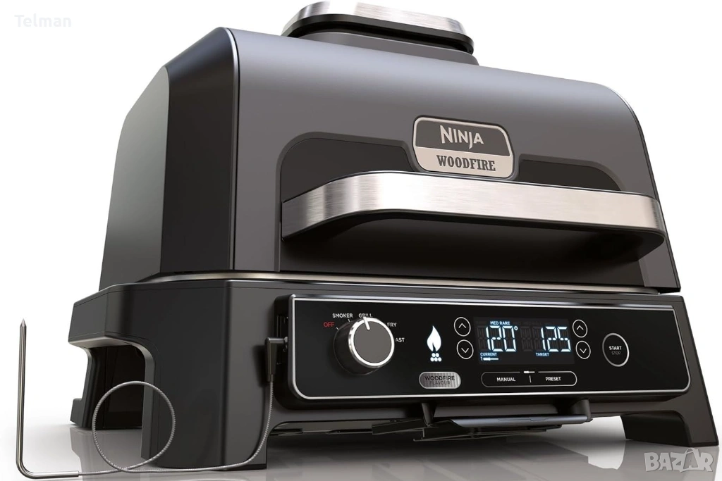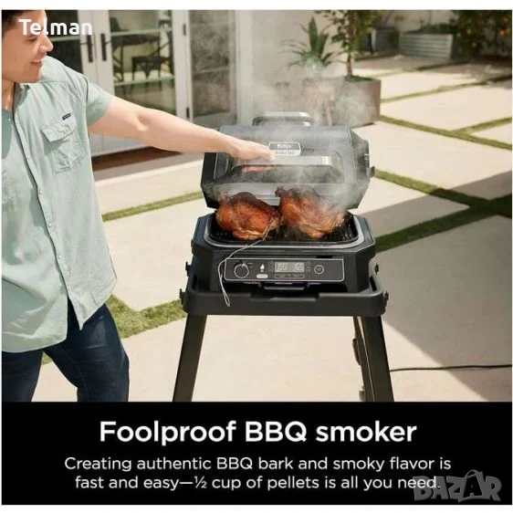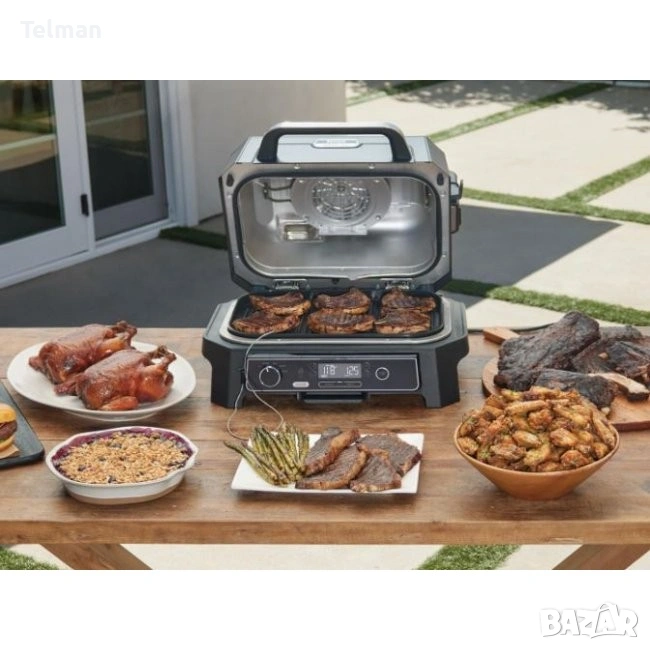 ЧИСТО НОВ NINJA OG850 Woodfire Pro XL ВЪНШЕН ГРИЛ И ПУШИЛКА С ВГРАДЕН ТЕРМОМЕТЪР, 4-в-1 ГЛАВНА СКАРА, ПУШИЛКА ЗА БАРБЕКЮ, ФРИТЮРНИК НА ОТКРИТО, ПЕЧЕНЕ, ПРЕНОСИМ, ЕЛЕКТРИЧЕСКИ.