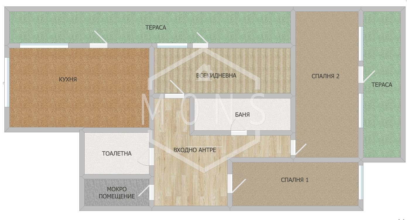 -Входно антре, кухня, всекидневна с излаз на тераса, две спални с обща тераса, баня, тоалетна, склад.