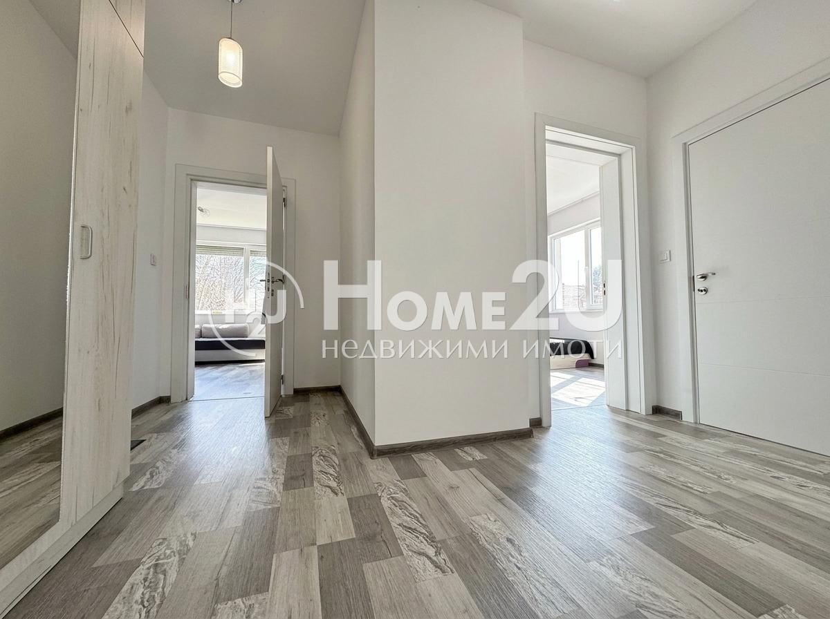 Разпределение: Просторно входно антре, широк коридор, голяма и светла родителска спалня, просторна и светла детска стая с излаз към тераса, светла дневна с кухня и излаз към тераса, баня с тоалетна. Етажът впечатлява с много добра осветеност, функционално разпределение и усещане за пространство. Към имотът има и приземен етаж със сменена дограма, коридор, две стаи и е подготвен за ремонт отлична възможност за обособяване на второ жилище, офис, работилница или зона за гости.