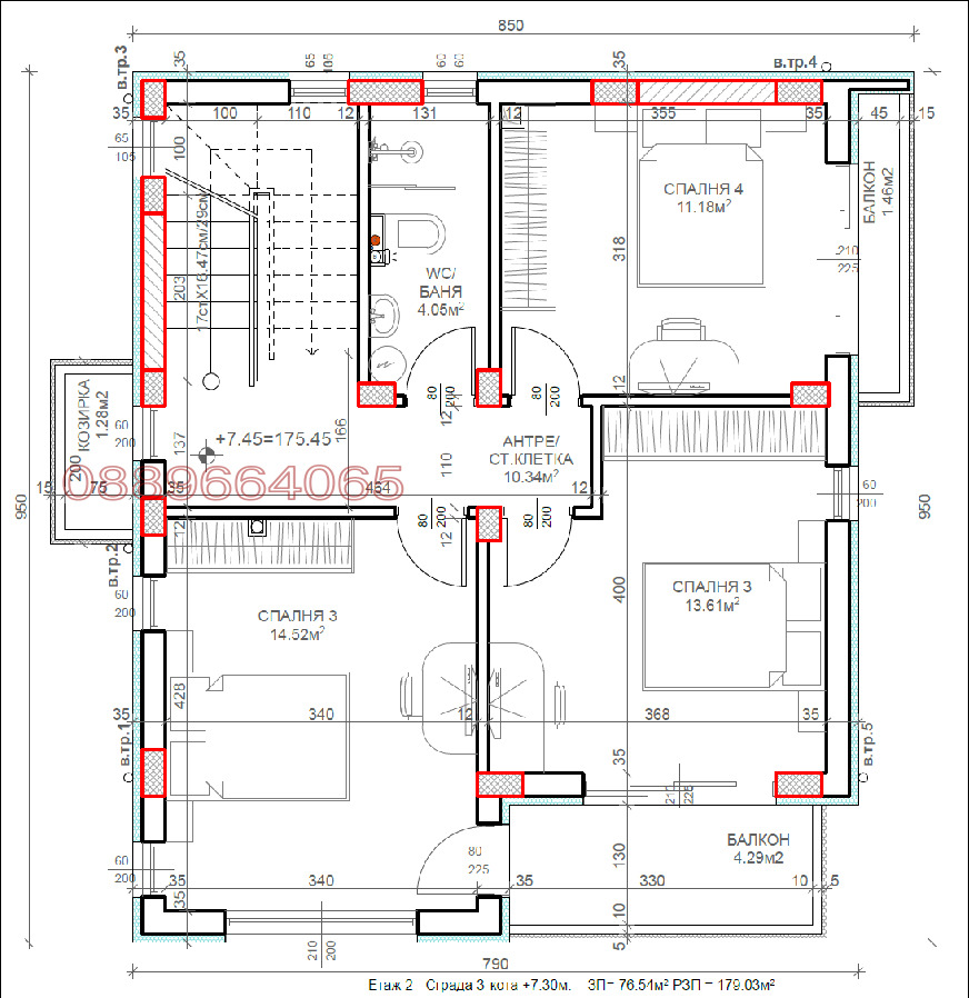 -Втори етаж- първа спалня 11,8м2, втора спалня 13,6м2, трета спалня 14,5м2, два балкона, баня с тоалетна, антре и сталбище