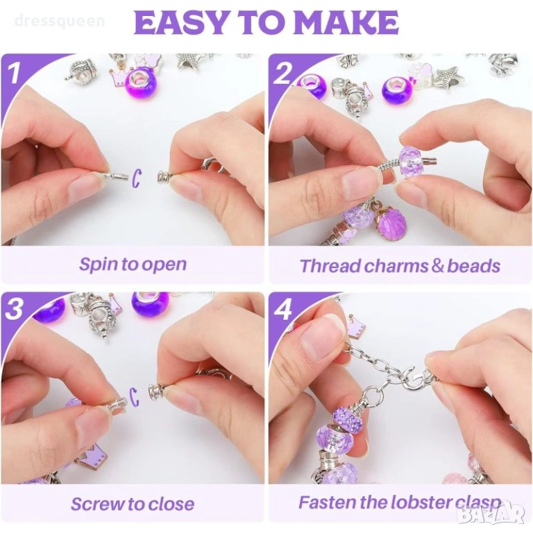 Практична Кутия: Елегантната кутия за съхранение (вижда се на снимката) гарантира, че всички детски талисмани за гривни ще бъдат подредени и лесно достъпни.