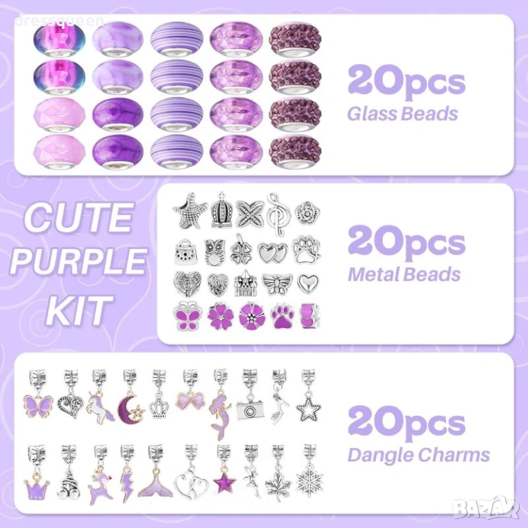Комплект за Гривни с Талисмани: Включва 3 регулируеми гривни, готови за декорация, както и 40 различни мъниста (цветни и метални).