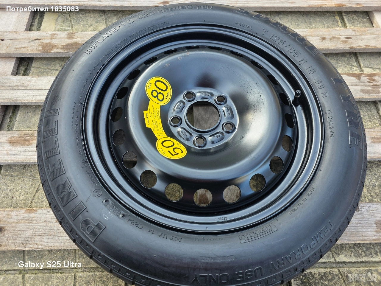 Продавам оригинална резервна гума тип патерица за Волво, Форд, Ягуар с размери 16" 5х108 4J ET25 ЦО63.4мм. с гума Pirelli 125/85/16
