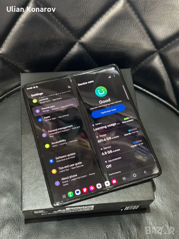 Телефона е неразличим от нов. Има леки драскотини по лайсните. Вътрешния дисплей понякога не хваща на места и като се затвори и отвори се оправя съобразено е с цената. В комплекта има кутия,игла и кабел за зареждане и калъф.