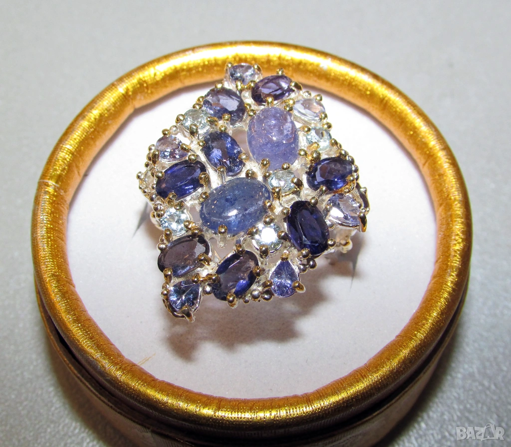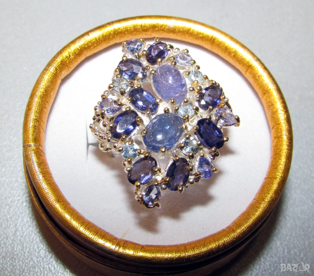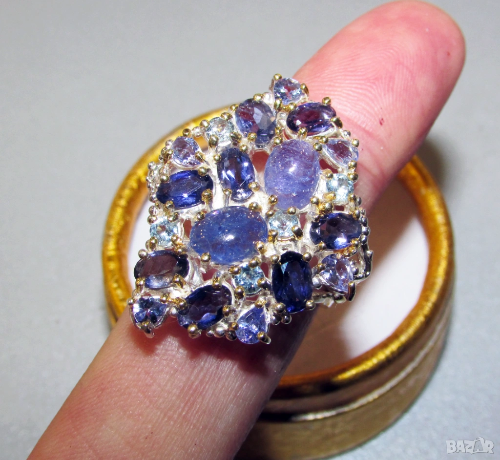 925 сребърен пръстен с натурален танзанит, тегло на пръстена 9.7гр. Халка 8.5/58. Другите камъни са иолит и топаз