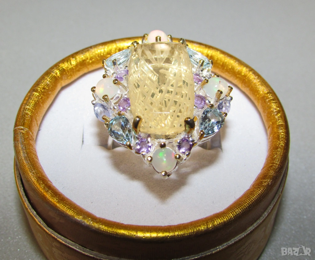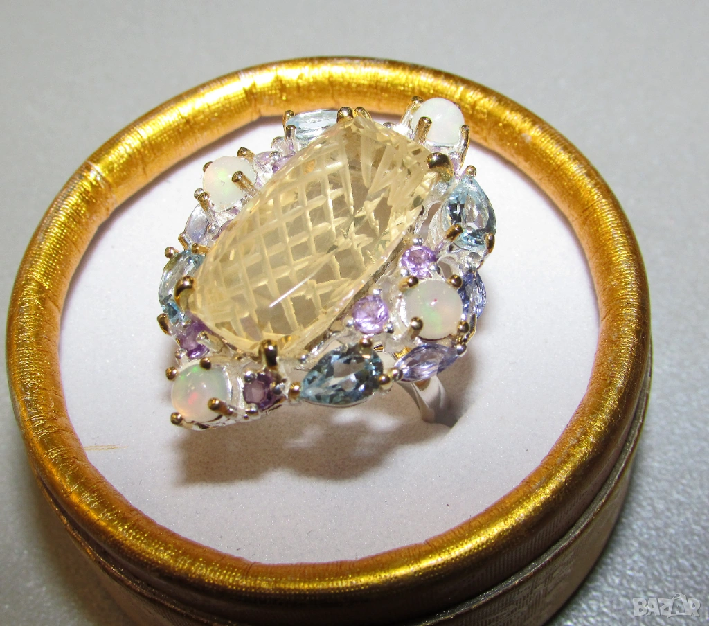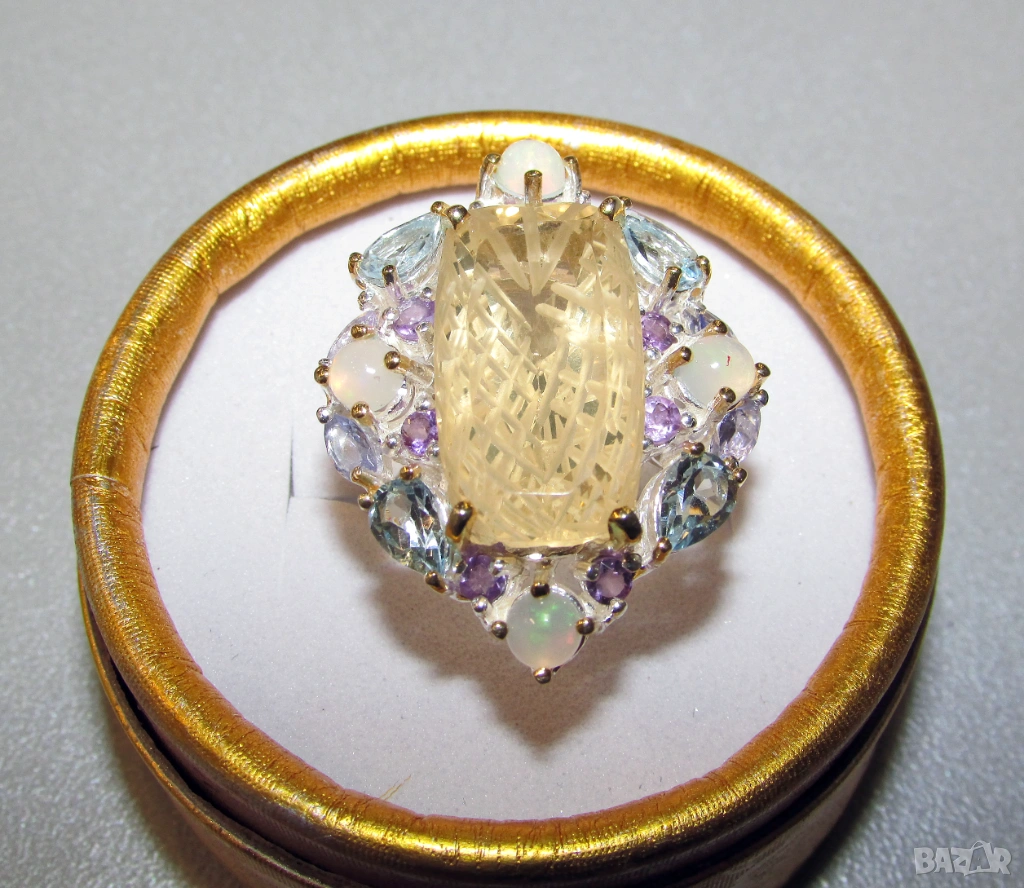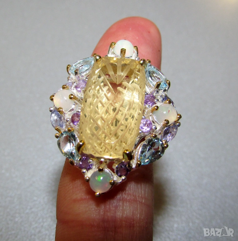 925 сребърен пръстен с гравиран лимонов кварц, не си личи от снимките но отгоре пръстена е гладък, гравировката е от долната страна. Камък 28 карата, тегло на пръстена 11.7гр. Основен камък 21x12мм. Другите камъни са топаз, опал и аметист. Халка 8.5/58. Цена 105 евро.