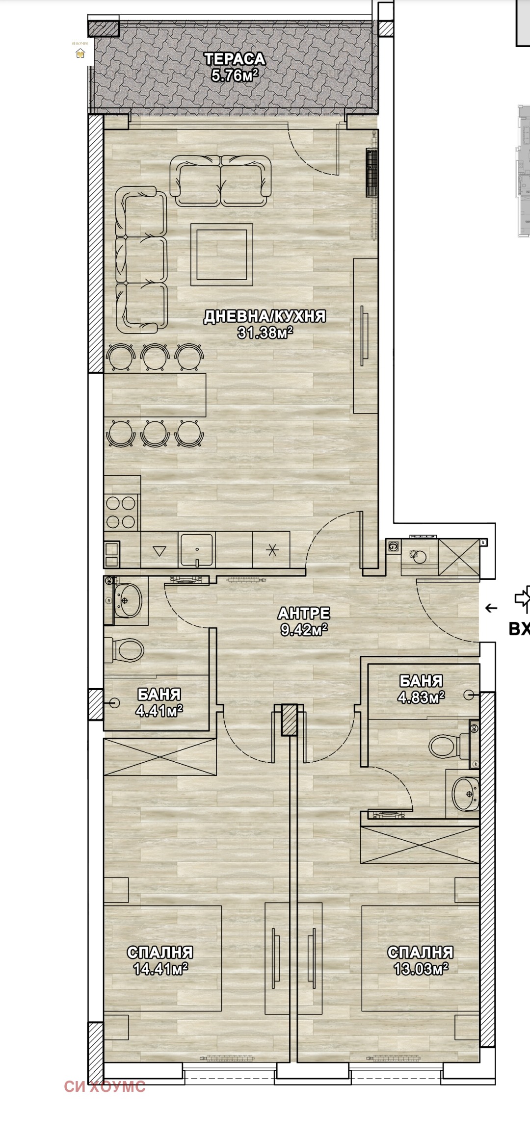 ✅ Обширна дневна с кухненски бокс (31,38 кв.м.) слънчево изложение и излаз на тераса (5,76 кв.м.);