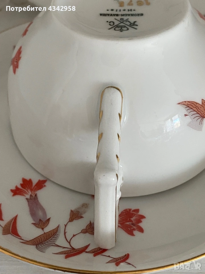 Произведен в Германия от фабрика R&C Kronach Bavaria в началото на XX век (около 1910–1930 г.). Фин баварски порцелан с красив червен флорален декор и златен кант.