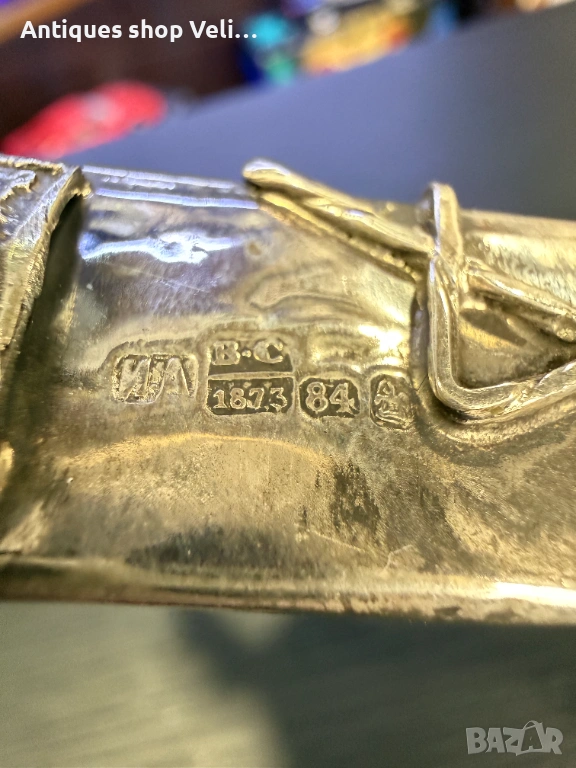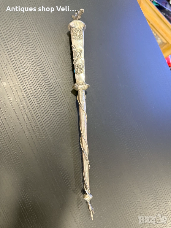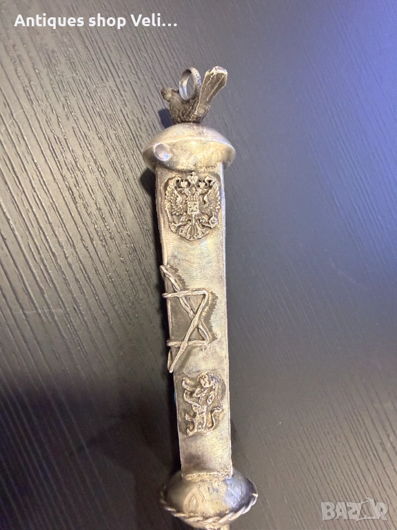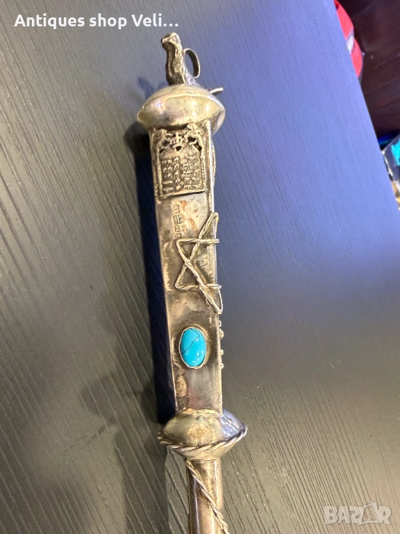 Сребърна показалка за четене на тора. Руско сребро с печат за проба и година. Дръжката е украсена с руски герб с двуглав орел, звездата на давид и инкрустиран син тюркоаз и лъв.