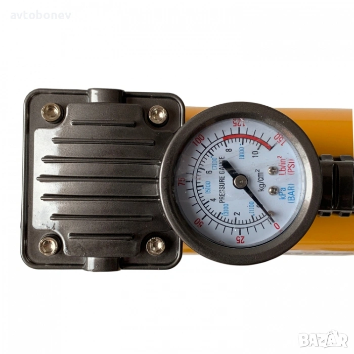 - Двуцилиндров компресор с манометър за помпене на микробуси, ATV, камиони, автомобилни и велосипедни гуми, въздушни матраци и надуваеми принадлежности