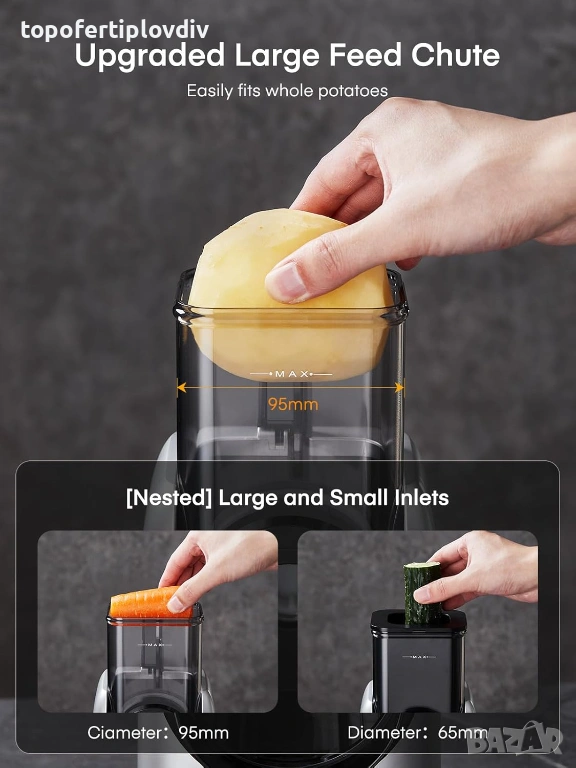 Подобрен отвор за подаване:Това ренде за зеленчуци има два размера отвор за подаване. Максималният диаметър на отвора за подаване за зеленчуци е 9,3 см, което му позволява да обработва по-големи зеленчуци; Вторият тип изисква само леко натискане на бутона на буталото, отстраняване на буталото и отворът за пълнене може да се регулира до 6,9 см.