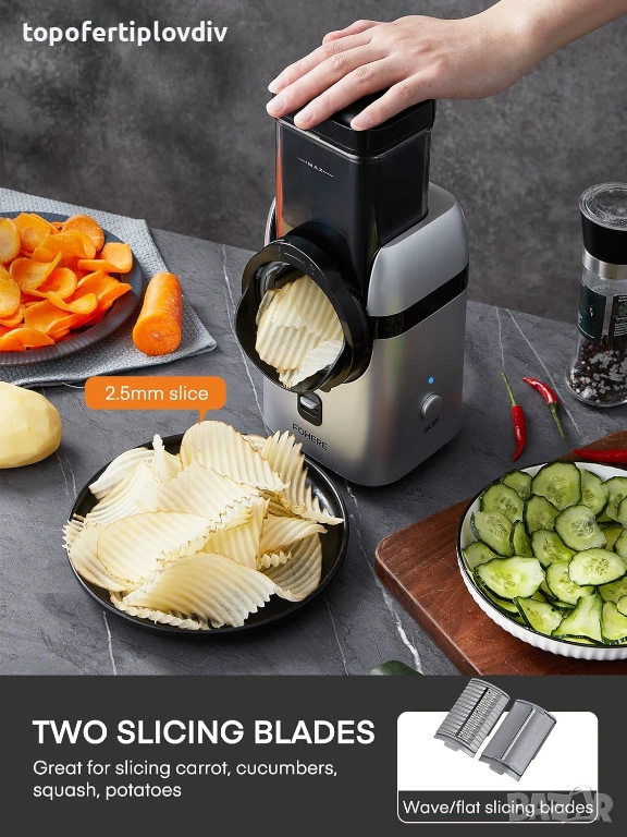 5 в 1 Електрическа ренде за сирене: Електрическата ренде се предлага с 5 вида подвижни остриета от неръждаема стомана: острие за едро ренде, острие за фино ренде, вълнообразно острие за рязане, острие за нарязване и острие за смилане (по едно за всяко острие). Този електрически резач за зеленчуци може да реже картофи на чипс, да нарязва банани и ябълки, да счупва ядки, да прави трохи от бисквитки, да настъргва шоколад, да реже сирене и др., което може да отговори на вашите нужди от рязане.