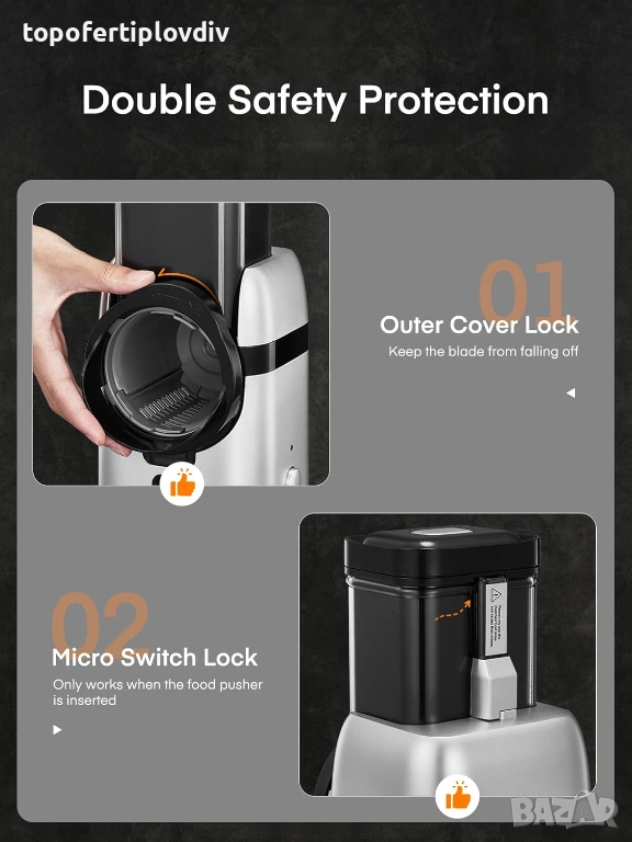 Двойна защита:Предпазният пръстен на изхода на рендето за сирене се върти обратно на часовниковата стрелка, като фиксира острието и предотвратява отклоняването му по време на работа. Дори ако превключвателят на резачката за сирене е включен, трябва да използвате буталото, за да активирате заключването на микропревключвателя на електрическата ренде, за да осигурите плавната работа на ножовете и ефективно да гарантирате вашата безопасност.