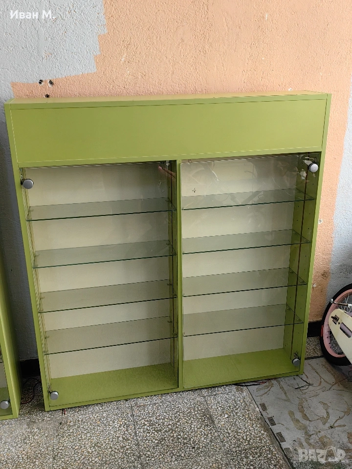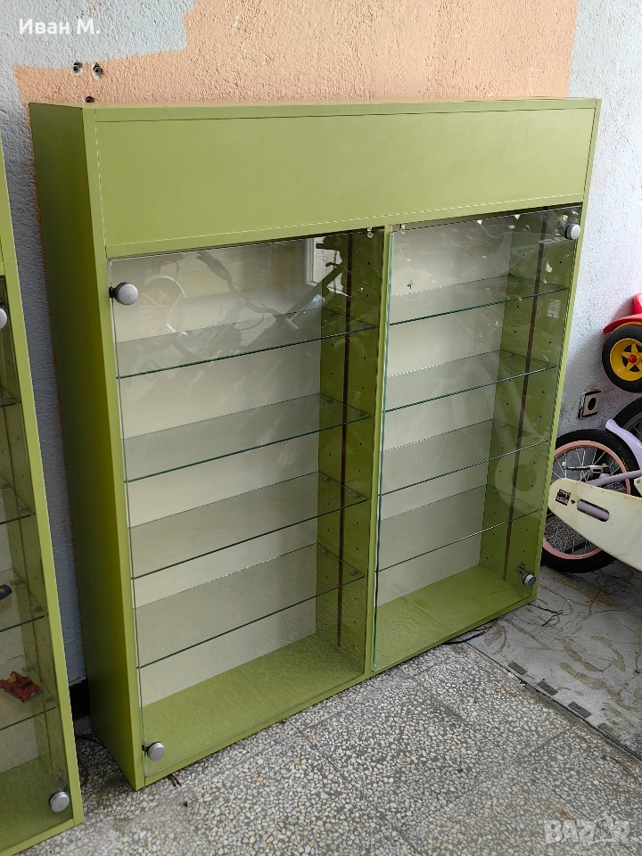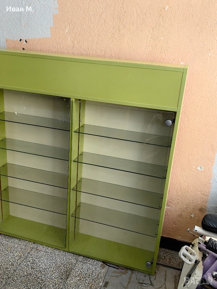 Дясната е с размери 120х110х20 см, рафтове от стъкло с канали за лед светлини, има лека забележка на стъклената вратичка, снимана е! Цена 120 евро.
