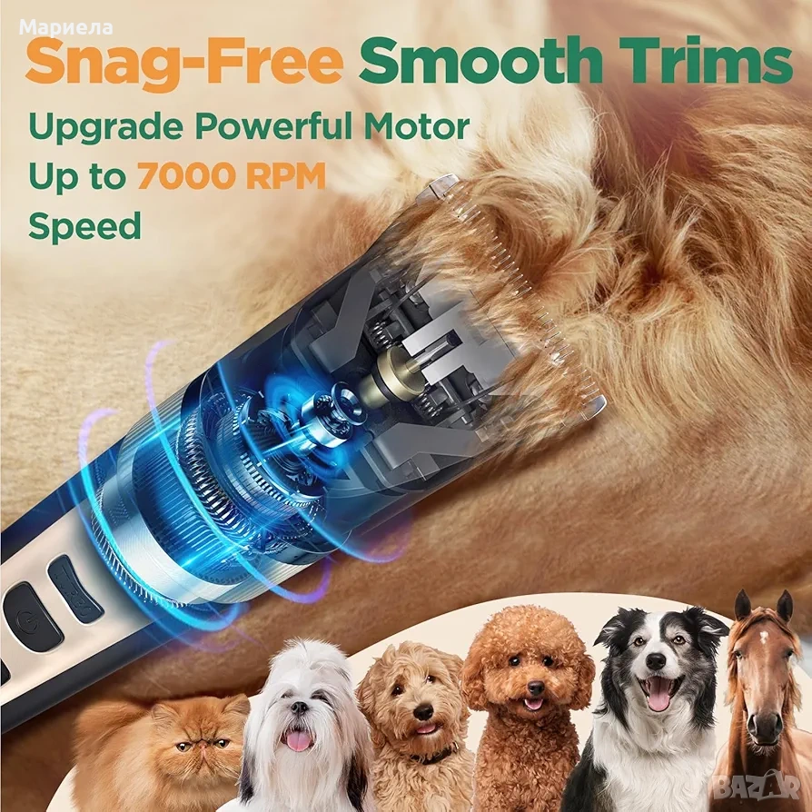 машинка за подстригване на домашни любимци】Машинките за подстригване на домашни любимци Gimars са оборудвани с прецизен мотор, ниски вибрации и ултра тих дизайн, който е без работен шум под 60 dB, което кара вашия домашен любимец да се чувства комфортно и да не се страхува от подстригване. Мощният мотор на професионалните машинки за подстригване на кучешка козина няма да прищипе или повреди козината на домашния любимец. 【Остри и безопасни керамични ножчета с мощен мотор】Моторът на машинката за подстригване на кучета може да достигне 6500 оборота в минута, висококачествените титаниеви ножчета и подвижните керамични ножчета работят заедно, за да осигурят отлична производителност при рязане, и не е нужно да се притеснявате, че звукът е твърде силен. Този тример работи само с минимум 65 децибела и няма да изплаши домашния ви любимец. 【Отличен живот на батерията и преносим безжичен дизайн】Прахосмукачката с литиева батерия 3350mAh, пълното зареждане може да издържи 90 минути, независимо дали се грижи за големи домашни любимци или за множество домашни любимци, е лесна за употреба. В допълнение към безжичния дизайн, тя е по-преносима при употреба. USB зарядното устройство поддържа различни методи за зареждане, удобна за употреба по всяко време и навсякъде. 【Лесен за употреба и водоустойчивост IPX7】Функциите за подрязване и засмукване работят лесно - натиснете продължително бутона за захранване, стандартното подрязване и засмукване се въртят едновременно, след което натиснете веднъж, за да изключите функцията за засмукване. Водоустойчивият дизайн IPX7 гарантира, че цялото тяло може да се почиства под вода, което улеснява почистването и поддръжката. 【Вземете домашния си любимец на дълго пътуване】Многофункционална кутия с инструменти, лесно съхранявайте и защитавайте инструментите си за подстригване. Удобно е също така да вземете комплектите за подстригване със себе си, когато пътувате. Просто се насладете на приятно пътуване с домашния си любимец 【Професионална машинка за подстригване на домашни любимци】Машинките за подстригване на домашни любимци Gimars са оборудвани с прецизен мотор, ниски вибрации и ултра тих дизайн, който е без работен шум под 60 dB, което кара вашия домашен любимец да се чувства комфортно и да не се страхува от подстригване. Мощният мотор на професионалните машинки за подстригване на кучешка козина няма да прищипе или повреди козината на домашния любимец. 【Остри и безопасни керамични ножчета с мощен мотор】Моторът на машинката за подстригване на кучета може да достигне 6500 оборота в минута, висококачествените титаниеви ножчета и подвижните керамични ножчета работят заедно, за да осигурят отлична производителност при рязане, и не е нужно да се притеснявате, че звукът е твърде силен. Този тример работи само с минимум 65 децибела и няма да изплаши домашния ви любимец. 【Отличен живот на батерията и преносим безжичен дизайн】Прахосмукачката с литиева батерия 3350mAh, пълното зареждане може да издържи 90 минути, независимо дали се грижи за големи домашни любимци или за множество домашни любимци, е лесна за употреба. В допълнение към безжичния дизайн, тя е по-преносима при употреба. USB зарядното устройство поддържа различни методи за зареждане, удобна за употреба по всяко време и навсякъде. 【Лесен за употреба и водоустойчивост I