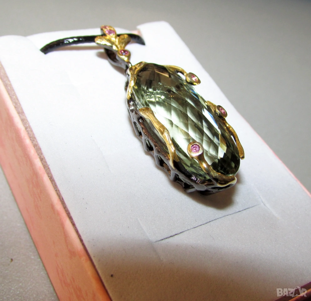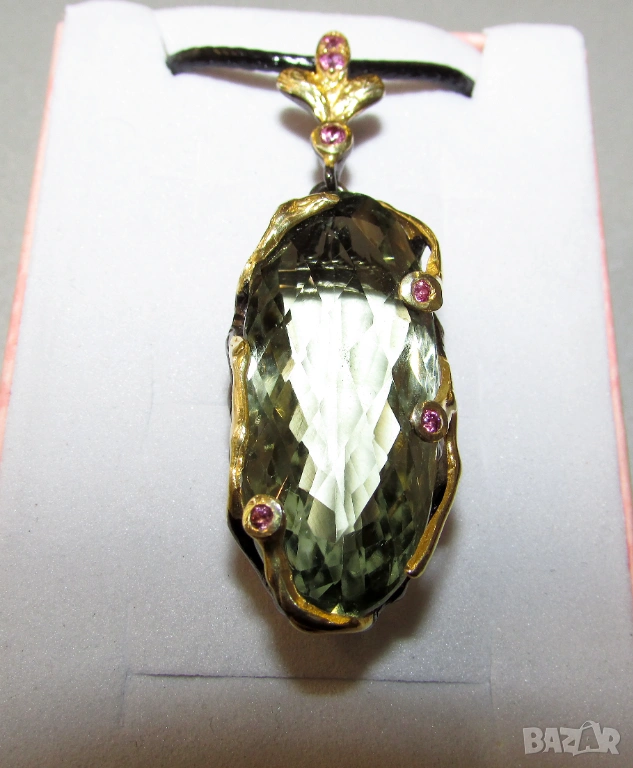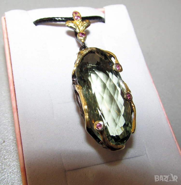 925 сребърно колие с натурален зелен аметист празиолит 40 карата с размери 50x16x12, тегло на колието 11гр. Другите камъни са родолит гранат. Произход Африка. Цена 100 евро.