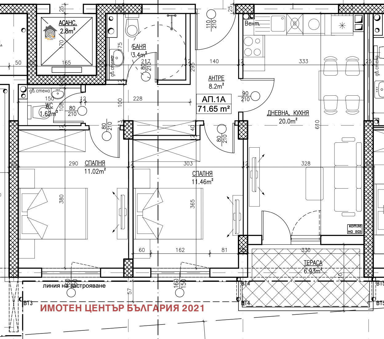 - Апартамента се състои от коридор, дневна с кухненски бокс с излаз на тераса, две спалня, баня с тоалетна и мокро помещение.