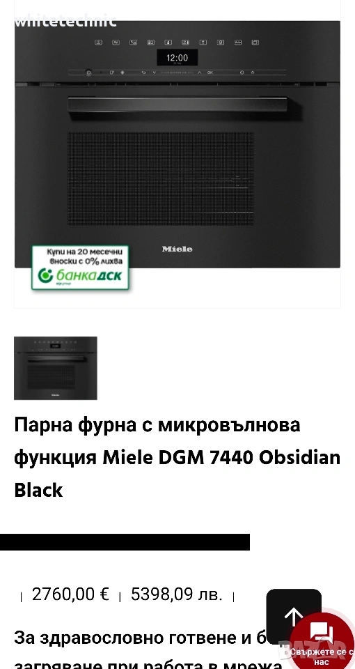 Представяме ви уред в отлично състояние, функционален и запазен. Визуалното състояние е безупречно, което го прави почти неотличим от нов. Уредът е поддържан с голямо внимание и грижа. Предлагаме го на вашето внимание с увереност в неговите качества. Това е идеалната възможност да придобиете надежден домашен помощник. За здравословно готвене и бързо загряване при работа в мрежа. Голям ясен текст със сензорни органи за управление - DirectSensor Перфектни резултати - технология DualSteam Посл. и бързи резултати при работа с микровълнова - бързо и нежно Идеални резултати, гарантирани всеки път - автоматични програми По-кратко време за готвене чрез комбинация на пара с микровълнова. Фурна за готвене на пара с микровълнова функция VitroLine Цвят на уреда Obsidian Black черно Функции за удобство Бързо и деликатно Външно генериране на пара Приготвяне на цяло меню без пренасяне на вкусове Автоматични програми с индивидуална настройка за резултатите при готвене Функция ”Пази топло” Режими на работа Размразяване Автоматични програми Автоматични програми в зависимост от страната Готвене на пара Бързо готвене ”Су вид” готвене Подгряване Микровълнова функция Специални приложения Удобство за потребителя Дисплей Управление DirectSensor Индивидуален избор на език Функция за пуканки Независимо от количеството готвене Готвене на пара на до 3 нива едновременно Приготвяне на меню Функция за отвеждане на пара преди края на програмата Дисплей за час Показване на дата Напомнящ таймер Програмируемо време за готвене Изобразяване на на действителната температура Показване на желаната температура Звуков сигнал при достигане на желаната температура Препоръчителни температури Бърз старт на микровълновата фурна Потребителски програми 20 Индивидуални настройки Ефективност и устойчивост Номинална мощност в режим “изключен” във W0,5 Номинална мощност в режим на готовност във W 1,0 Номинална мощност в мрежови режим на готовност във W 2,0 Време до автоматично превключване на режим на готовност в минути 20 Време до автоматично превключване на мрежови режим на готовност в минути 20 Време до автоматично превключване на режим “изключен” в минути 20 Удобство при почистване Външен парен генератор Нагревателен елемент на дъното за намаляване на конденза Програма за накисване Бързосвалящи се странични решетки Автоматично почистване от котлен камък Врата CleanGlass Парна технология и захранване с вода DualSteam Обем на резервоара за прясна вода в l1,5 Изваждане на резервоара за прясна вода с механизъм ”натисни и освободи” Безопасност Система за охлаждане на уреда със студен преден панел Ключ за безопасност Блокировка на включването Система за охлаждане с изпаряване Технически характеристики Обем на фурната в l40 Брой на нивата на решетките 4 Лампа на фурната 2 LED Нива на микровълнова мощност във W 80/150/300/450/600/850/1000 Дълбочина на нишата в mm550 Ширина на уреда в mm595 Височина на уреда в mm455 Дълбочина на уреда в mm569 Тегло в kg30,7 Общ включен товар в kW3,3 Напрежение във V230 Честота в Hz 50 Брой фази 1 Номинална стойност на предпазителя в А 16 Дължина на захранващ кабел в m 2,0 Стандартни аксесоари Свалящи се странични водачи (двойка) 1 Перфориран съд за готвене на пара от неръждаема стомана 2 Масивни готварски съдове от неръждаема стомана, високи 40 mm