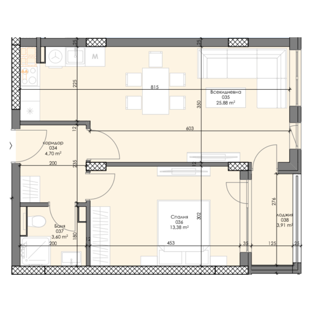 🔷 Разпределение: входно антре, всекидневна с кухненски бокс, спалня, баня с тоалетна, лоджия.