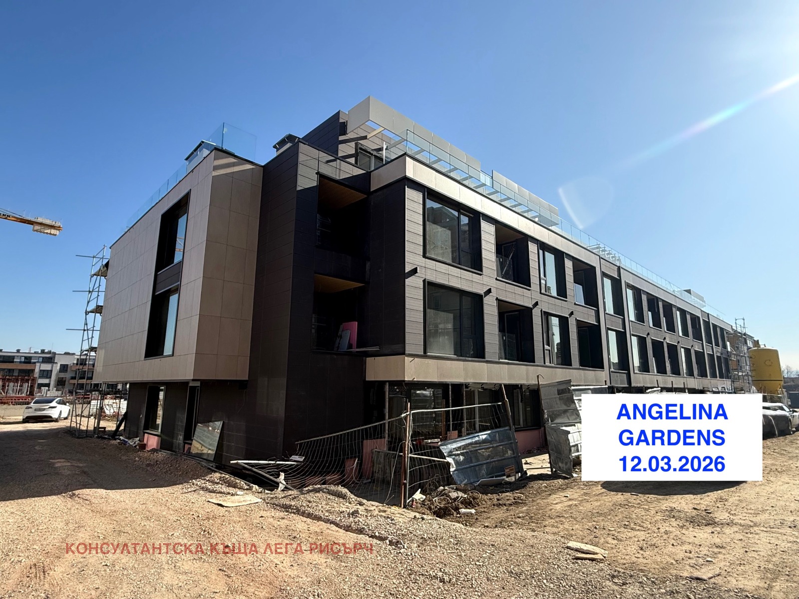 ANGELINA GARDENS е разположена в самостоятелен имот, изцяло СОБСТВЕНОСТ НА ИНВЕСТИТОРА, който строи със СОБСТВЕНИ СРЕДСТВА. Предвидена е с три жилищни входа, всеки от които ще разполага с луксозно входно фоайе.