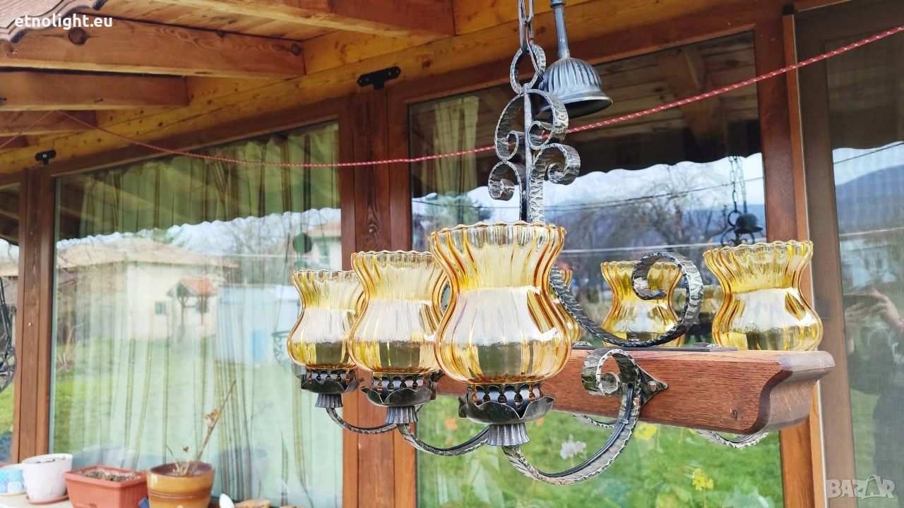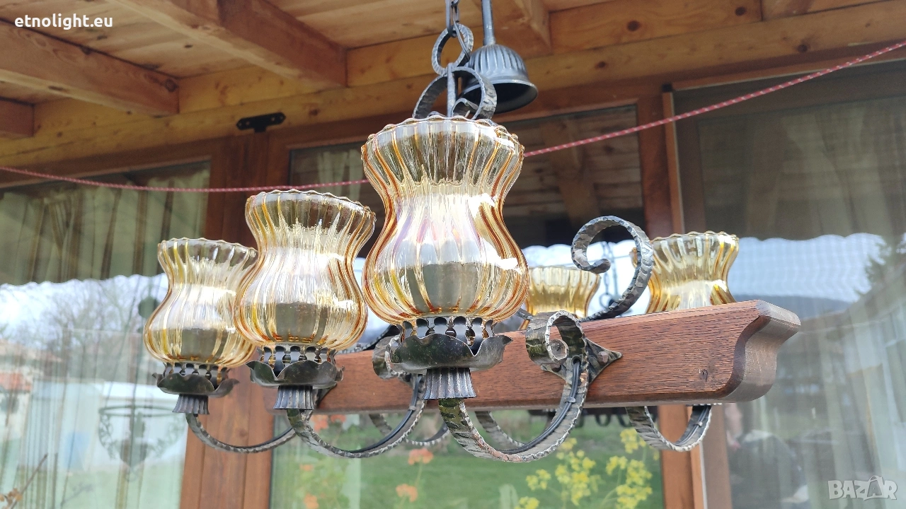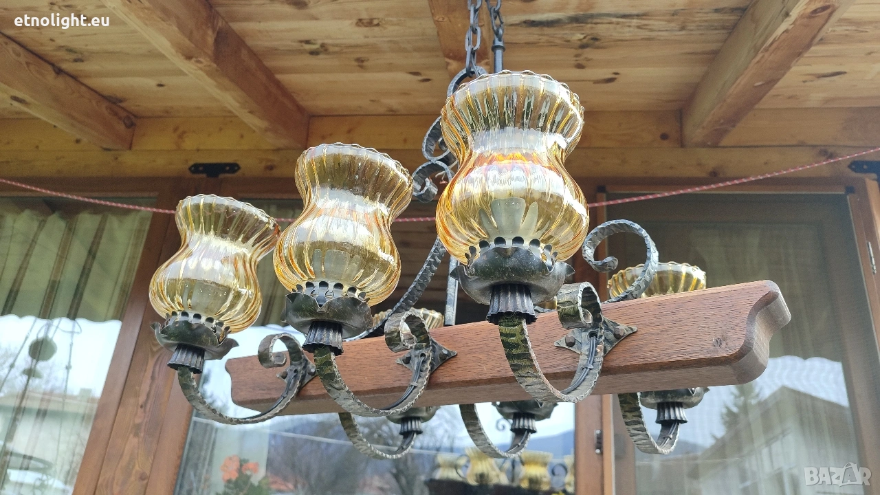 Красив полилей съчетание от дървена греда, ковано желязо и жълти стъкленици → Обява 53812724