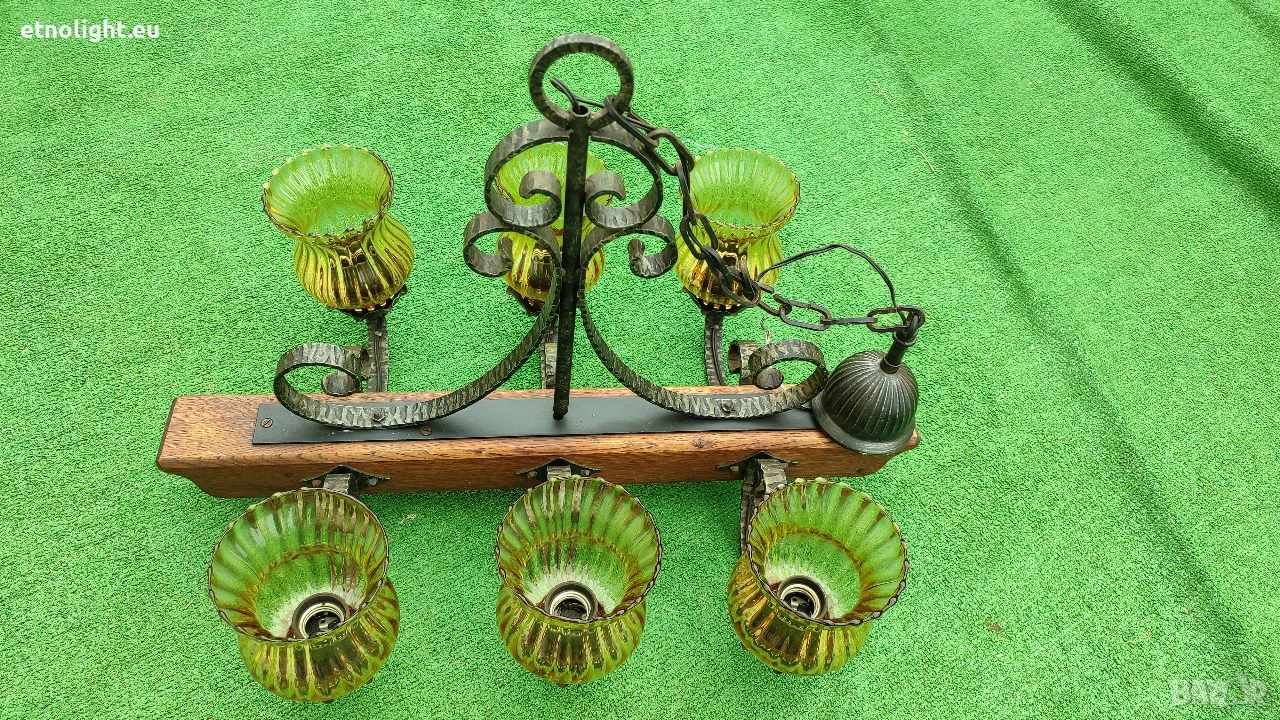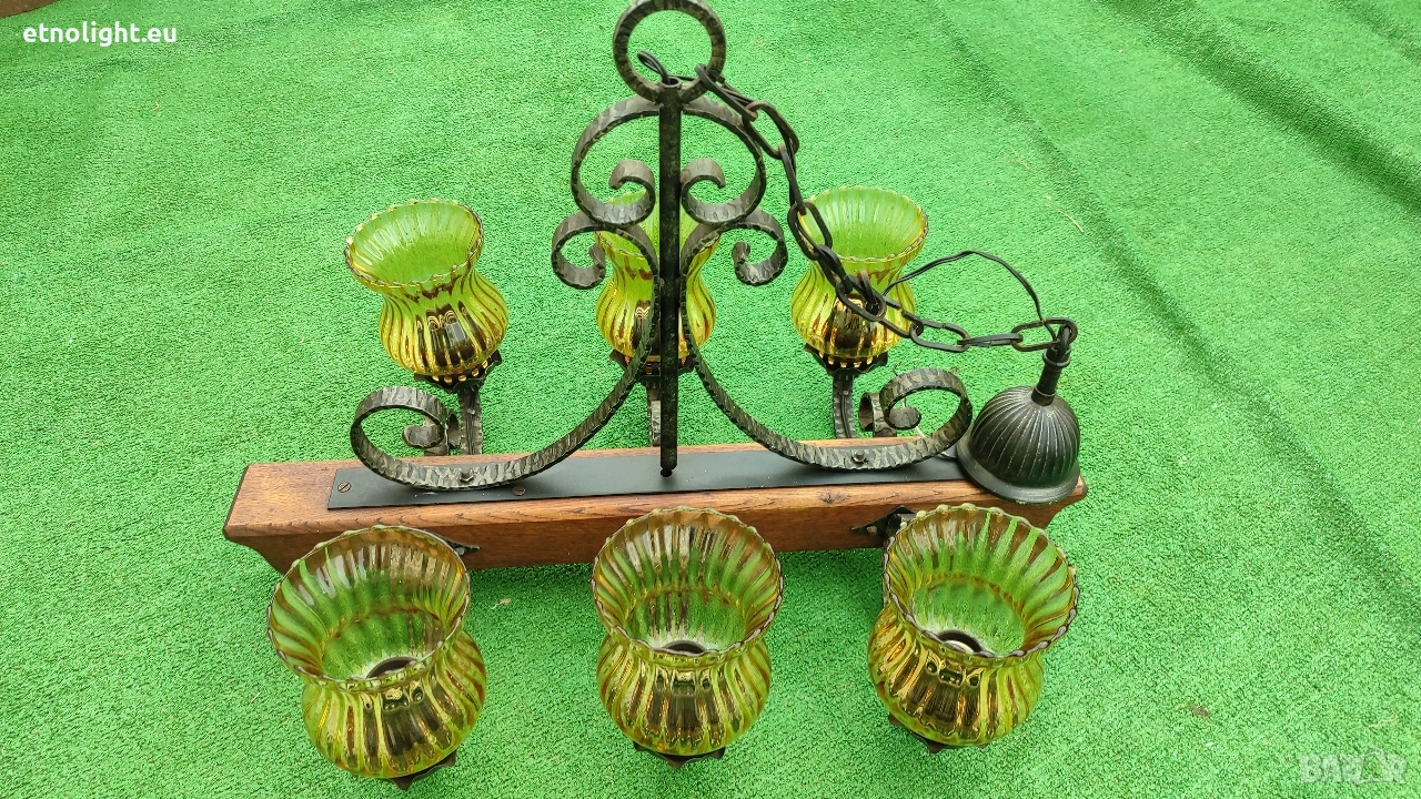 дължина 65 см, фасунгите са Е 27 стандартни, със синджири и розетка, жълти стъкленици, ковано желязо и греда